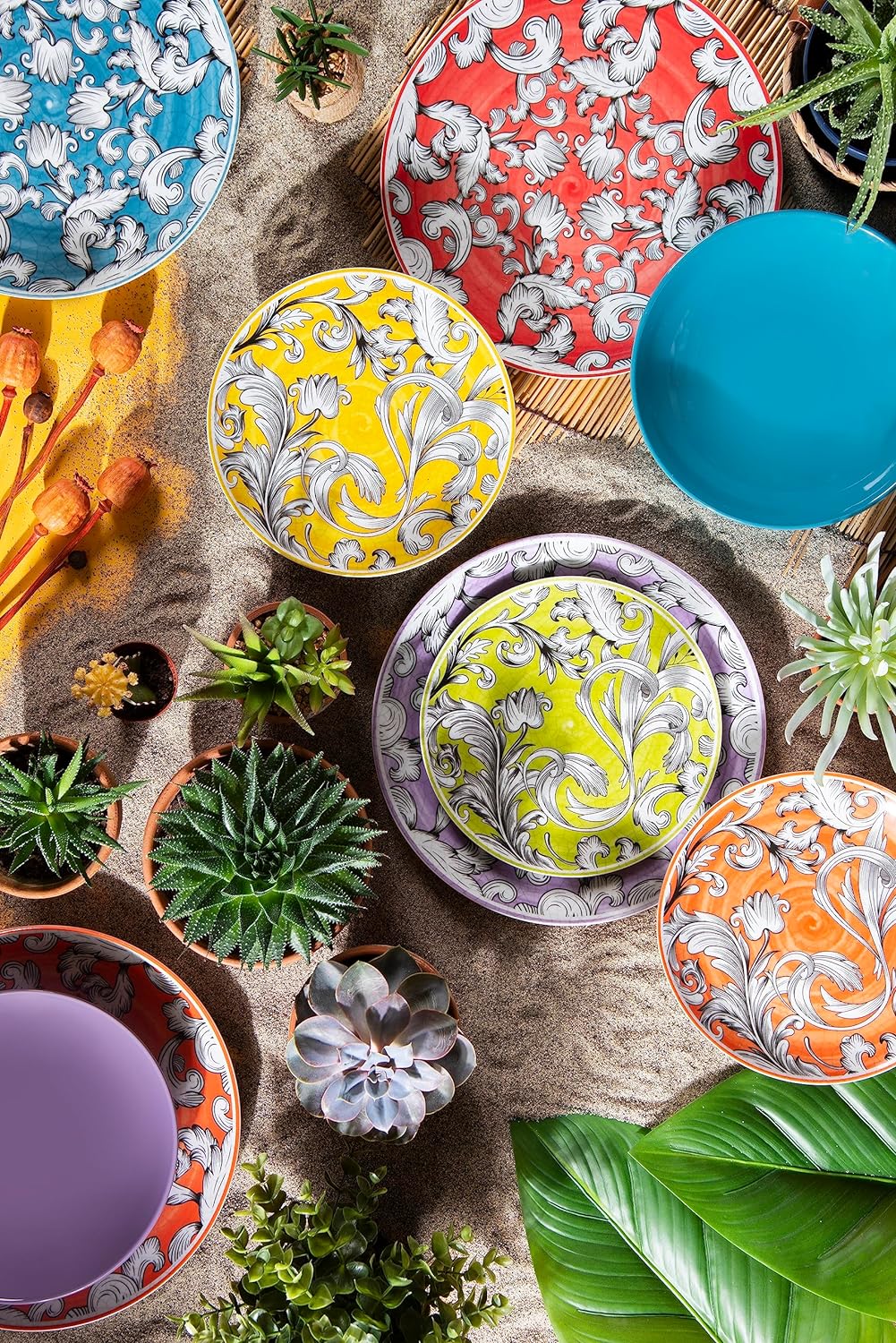 Variante: Set 18 Pezzi Scirocco Dekor mit Rotem, Gelbem Hintergrund, Grün, Hellblau, Lila, Orange. Suppenteller: Rot, Gelb, Grün, Hellblau, Lila, Orange.