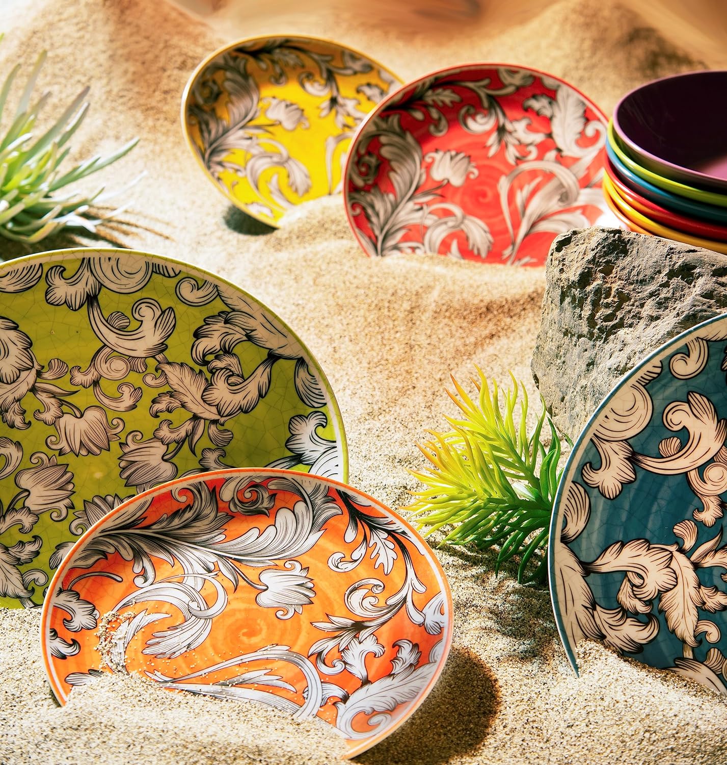 - Speiseteller und Obstteller mit Scirocco-Dekor, Suppenteller in 6 Farben sortiert: Rot, Orange, Gelb, Grün, Hellblau und Lila