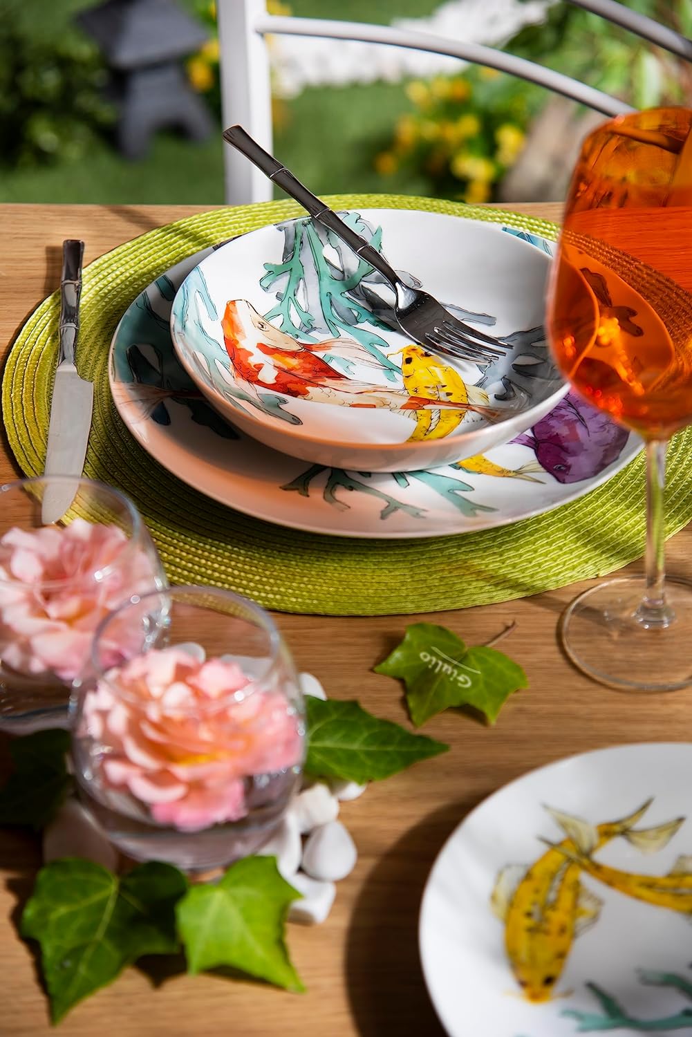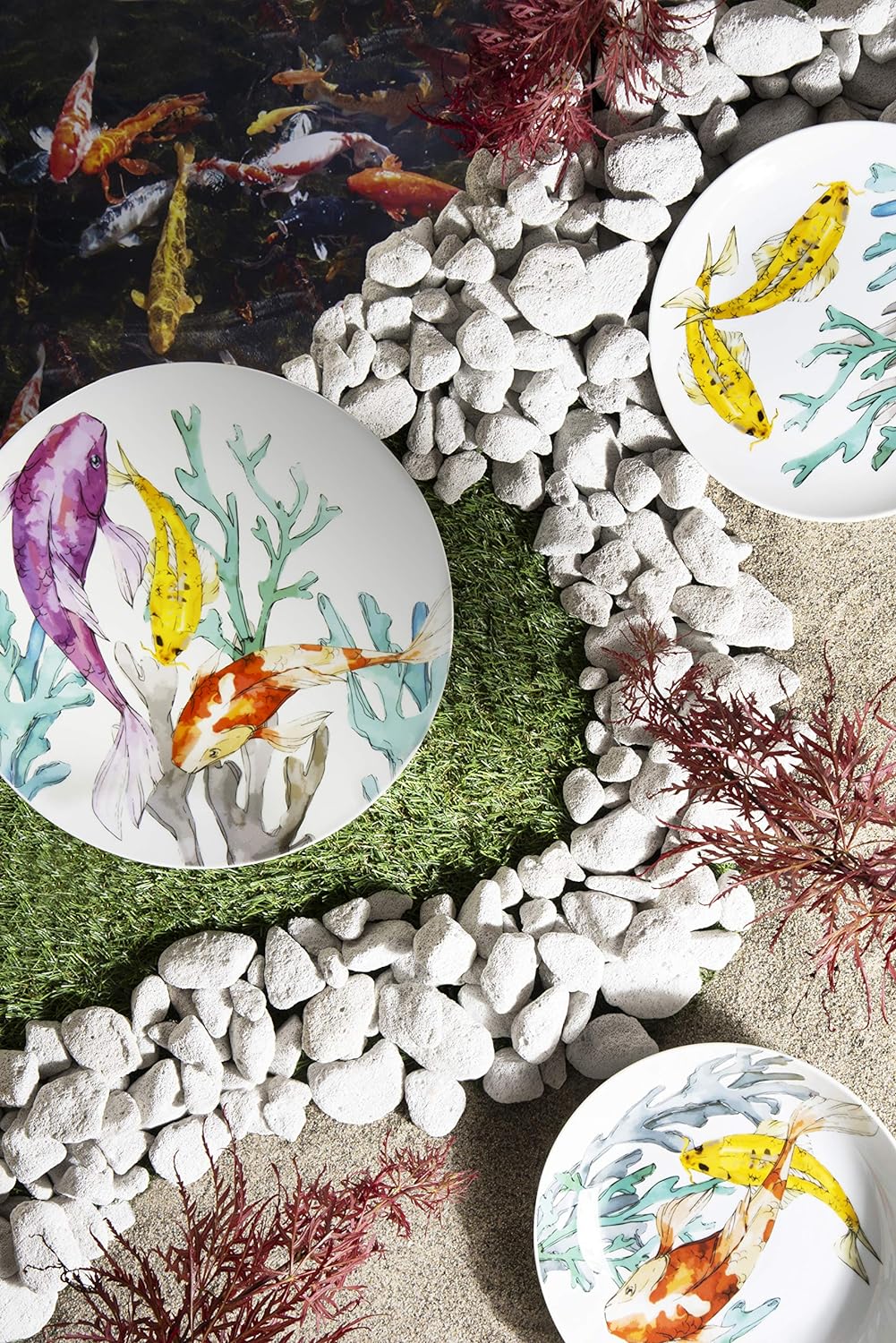 - DESIGN: Das Service ist dekoriert mit bunten Koi-Karpfen, Symbol für Unkonformität, Stärke und Glück schlechthin in der japanischen Kultur, die sich kurvenreich in klarem und unberührtem Wasser bewegen, um diesen Gerichten eine perfekte japanische