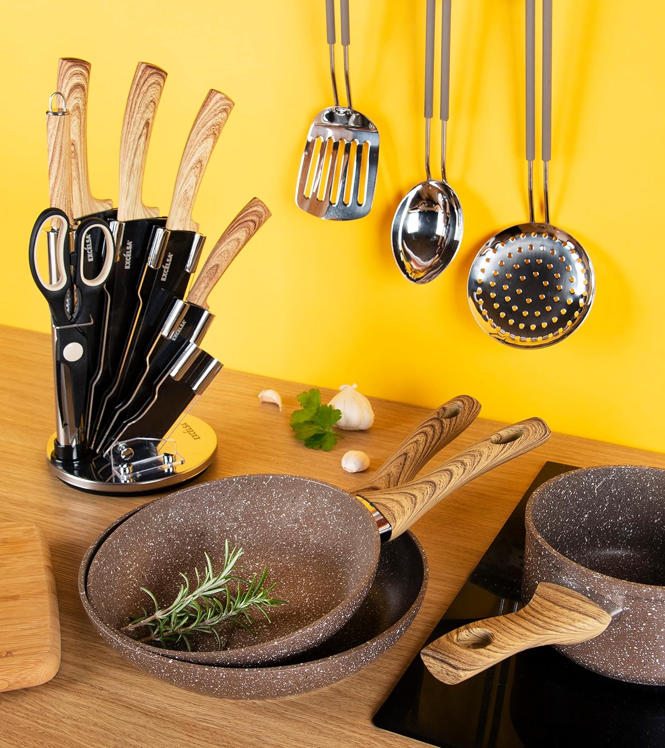 - Kochtopfset aus hochfestem geschmiedetem Aluminium; Set bestehend aus: 1 Pfanne Durchmesser 20 cm; 1 Pfanne Durchmesser 24 cm; 1 Pfanne Durchmesser 28 cm.