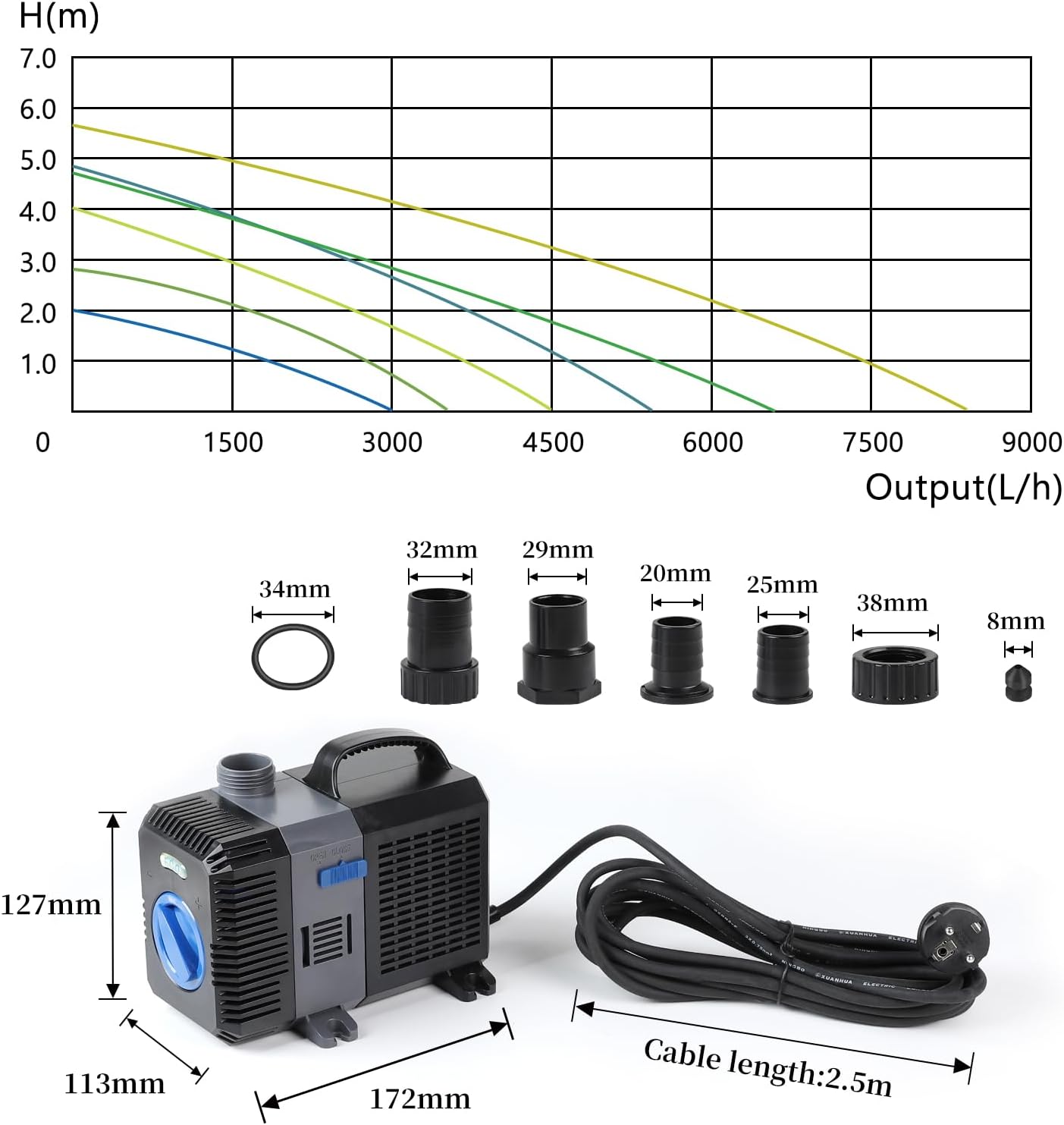 - ▲Leistung: 10W, Max. Fördermeng: 3000L/H, Max. Förderhöhe: 2,0m, Ausgang-Adapter: 3/4Zoll(19mm), 1Zoll(25mm), 1-1/4Zoll(32mm). Die Länge des Kabels : 2,5 m.