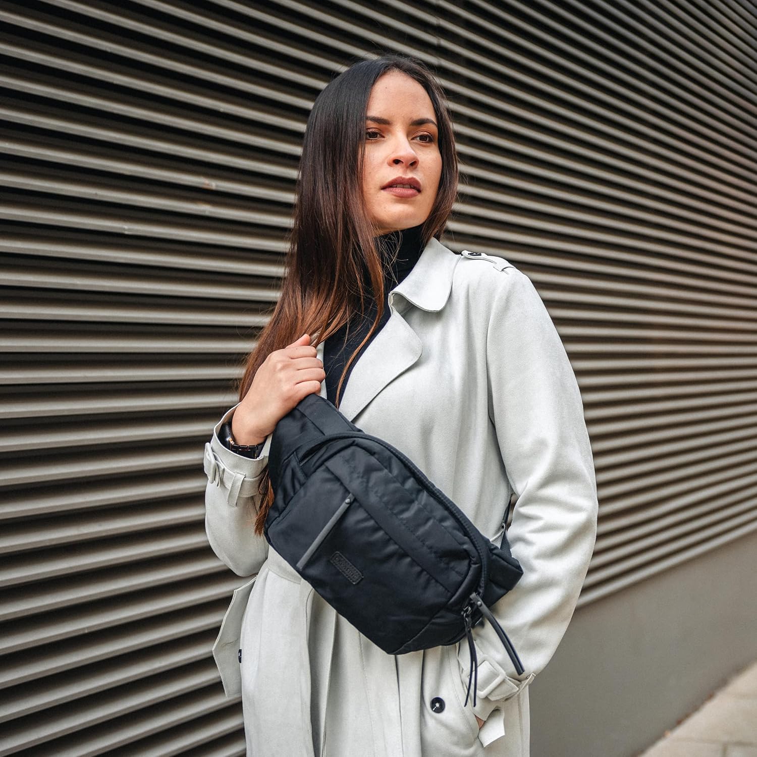 - FLEXIBLE TRAGEMÖGLICHKEITEN: Der Gurt ist flexibel von zwei Seiten verstellbar, sodass die Bauchtasche je nach Belieben um die Hüfte oder trendbewusst über die Schulter getragen werden kann