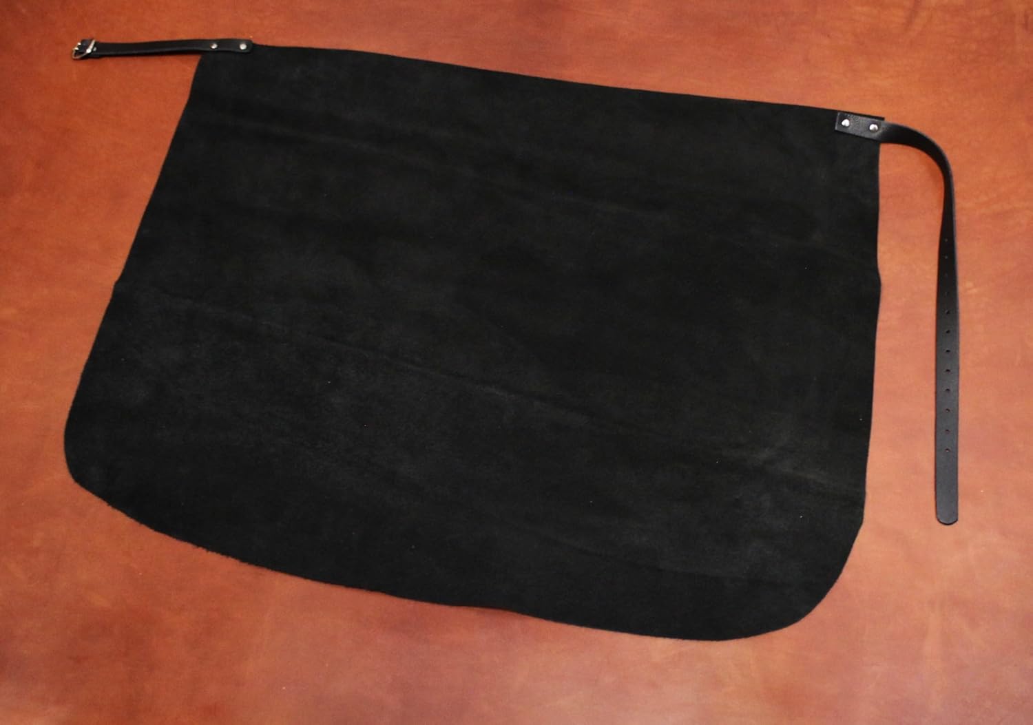 - STARKES ECHT LEDER - Kerniges Velourleder (auch umgedrehte Vollleder) in schwarz mit einer Stärke von 2,0-2,2 mm - verarbeitet zu einer Arbeitsschürze von ca. 60 cm Breite und einer Höhe von 53-57 cm. Kräftige Beriemungen bis zu ca. 120 cm Umfang