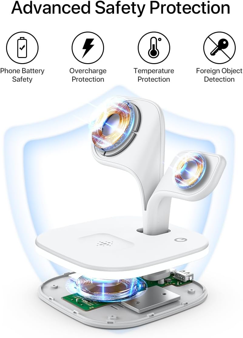 - 5-in-1 Design: Diese iPhone Ladestation vereint Funktionalität und Design: Sie lädt gleichzeitig Ihr iPhone, Ihre AirPods und Ihre Apple Watch auf – alles in einem Gerät. Zusätzlich verfügt sie über ein integriertes Nachtlicht mit drei