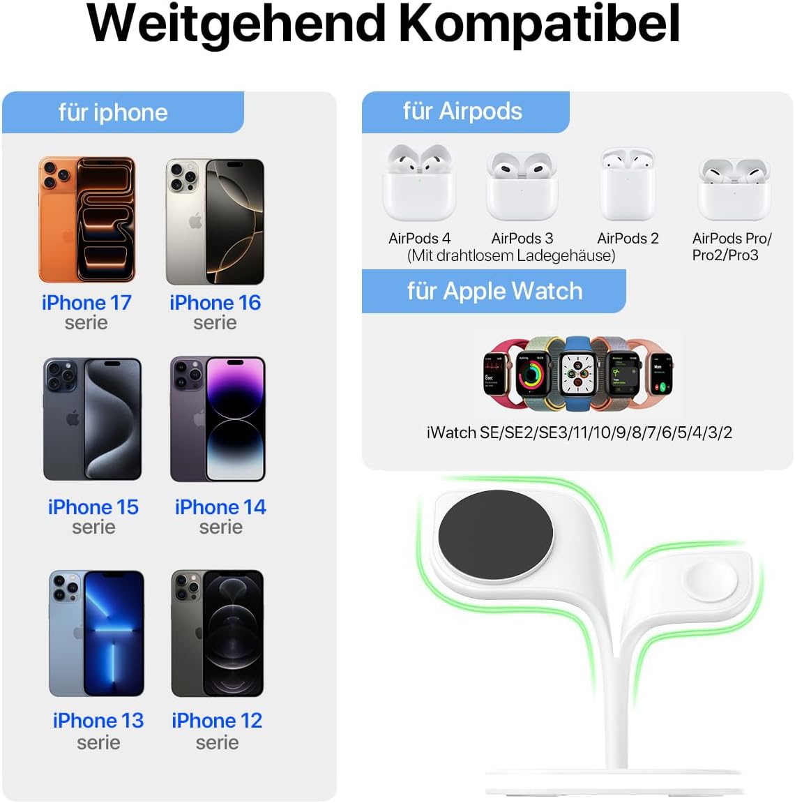 - Modellkompatibilität: Profitieren Sie von schnellem kabellosen Laden mit bis zu 15W. Diese 3-in-1 Apple Ladestation ist kompatibel mit der iPhone 17/16/15/14/13/12 Serie, Apple Watch Ultra/SE/Serie 2/3/4/5/6/7/8/9/10 sowie mit AirPods 2, 3, 4, Pro und