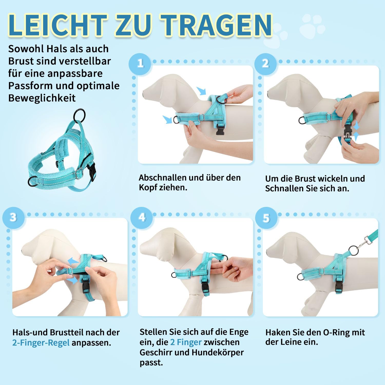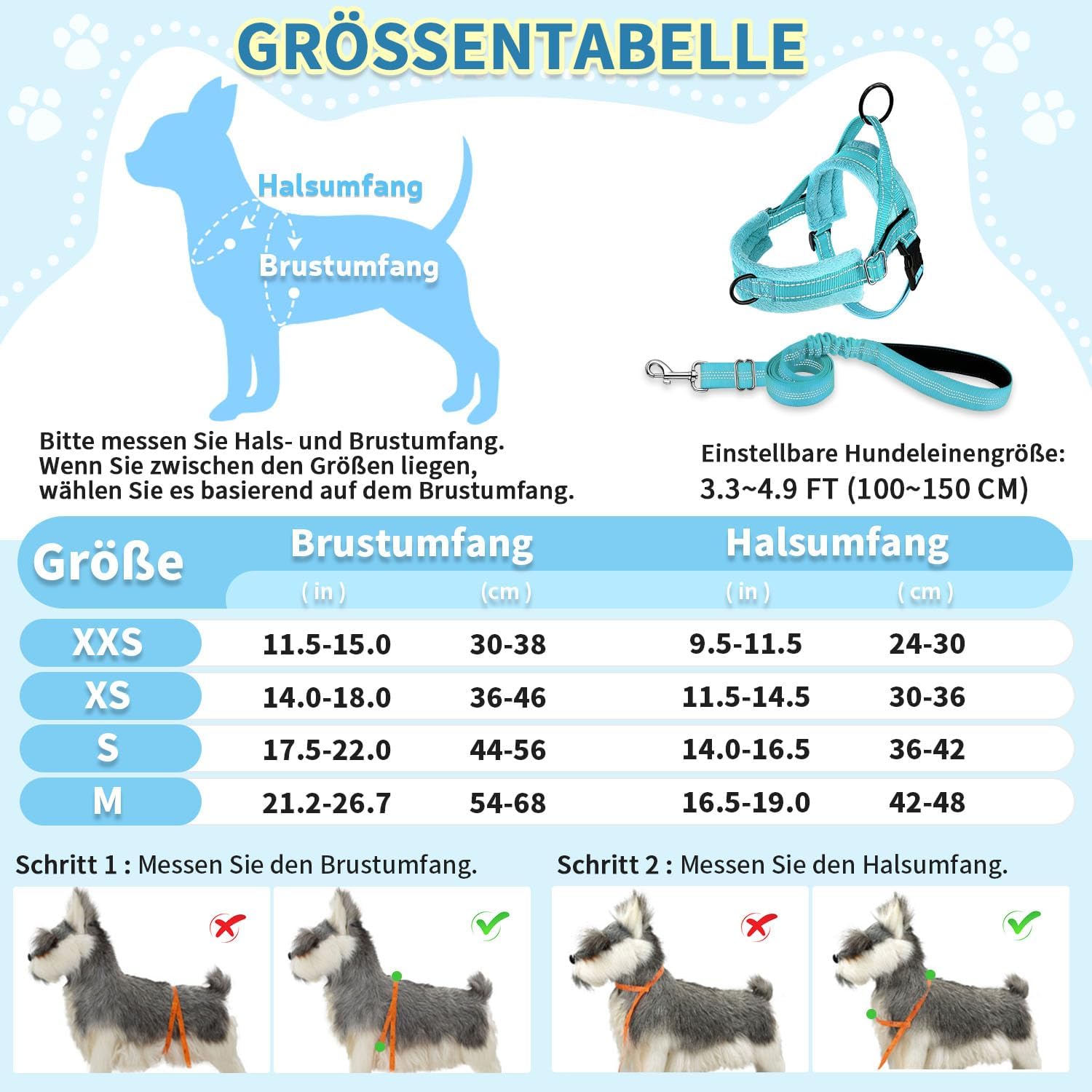 - 【Schnell zu montieren und einfach zu benutzen】: Dieses Hundegeschirr lässt sich leicht an- und ausziehen. Einfach über den Kopf des Hundes schieben und bequem um den Körper legen. Die 120 cm lange Leine besteht aus strapazierfähigem Nylon und
