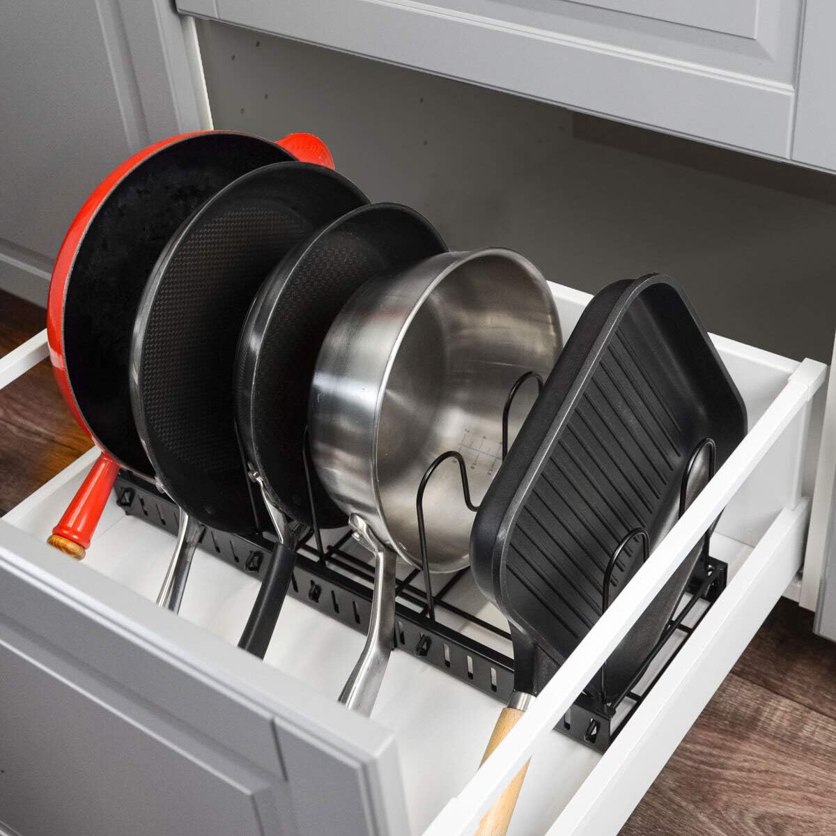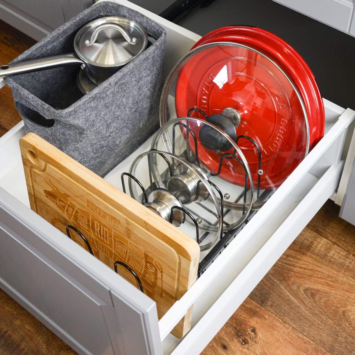 - MIT EINEM GRIFF DIE RICHTIGE PFANNE - Du musst nie wieder die ganze Schublade ausräumen, um den passenden Topf zu finden: Der Organizer für Pfannen, Töpfe & Topfdeckel macht Schluss mit Chaos im Schrank.