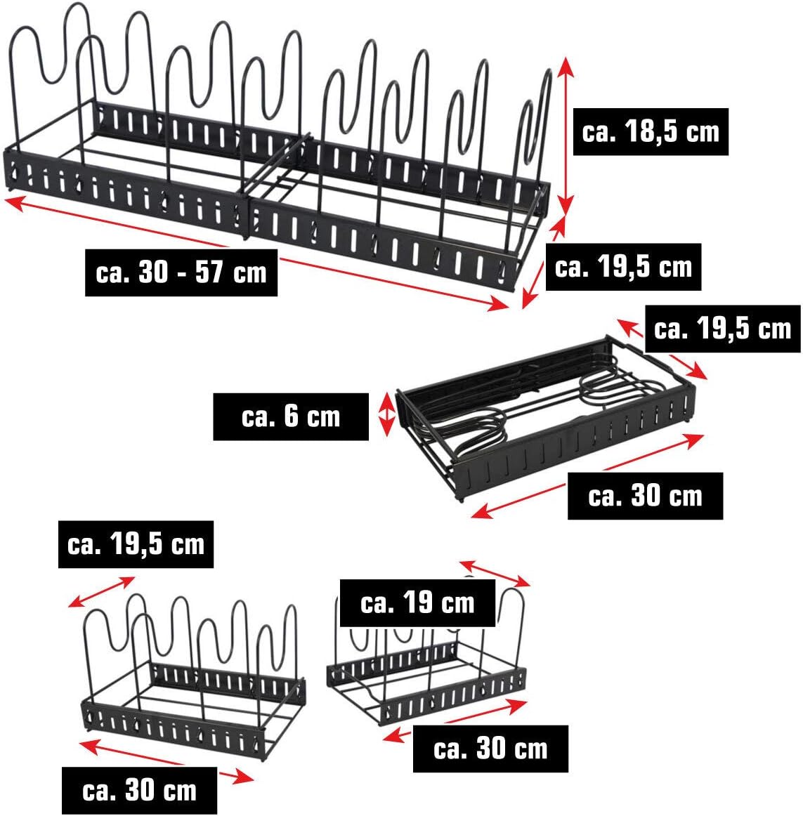 - FLEXIBEL VERSTELLBAR VON 30-57 CM - Für Küchenschrank und Schubladen mit ca. 19 cm Mindest-Höhe. Der robuste Ständer besteht aus 2 Regalen, die ineinander geschoben werden. Dazu: 8 Trenner zum Einstecken.