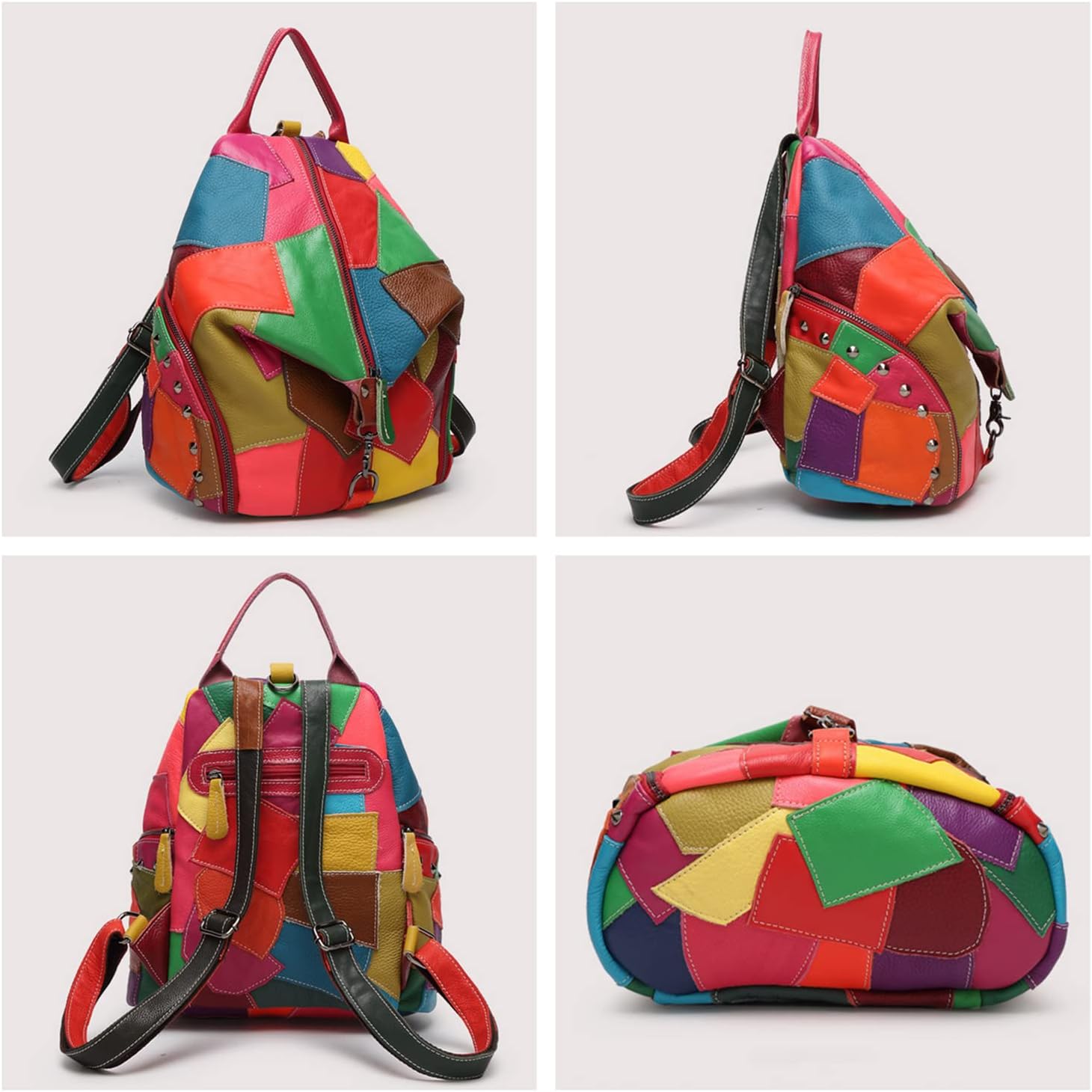- đăDESIGNăEin farbenfroher Lederrucksack passt zu jeder Kleidung und ist ein echter Hingucker. Verschiedene Farbblöcke des Rucksacks werden unregelmĂ€ssig zusammengefĂŒgt, die einzelnen Farben der Felder sind ein Unikat und wichen von dem Bild ab.