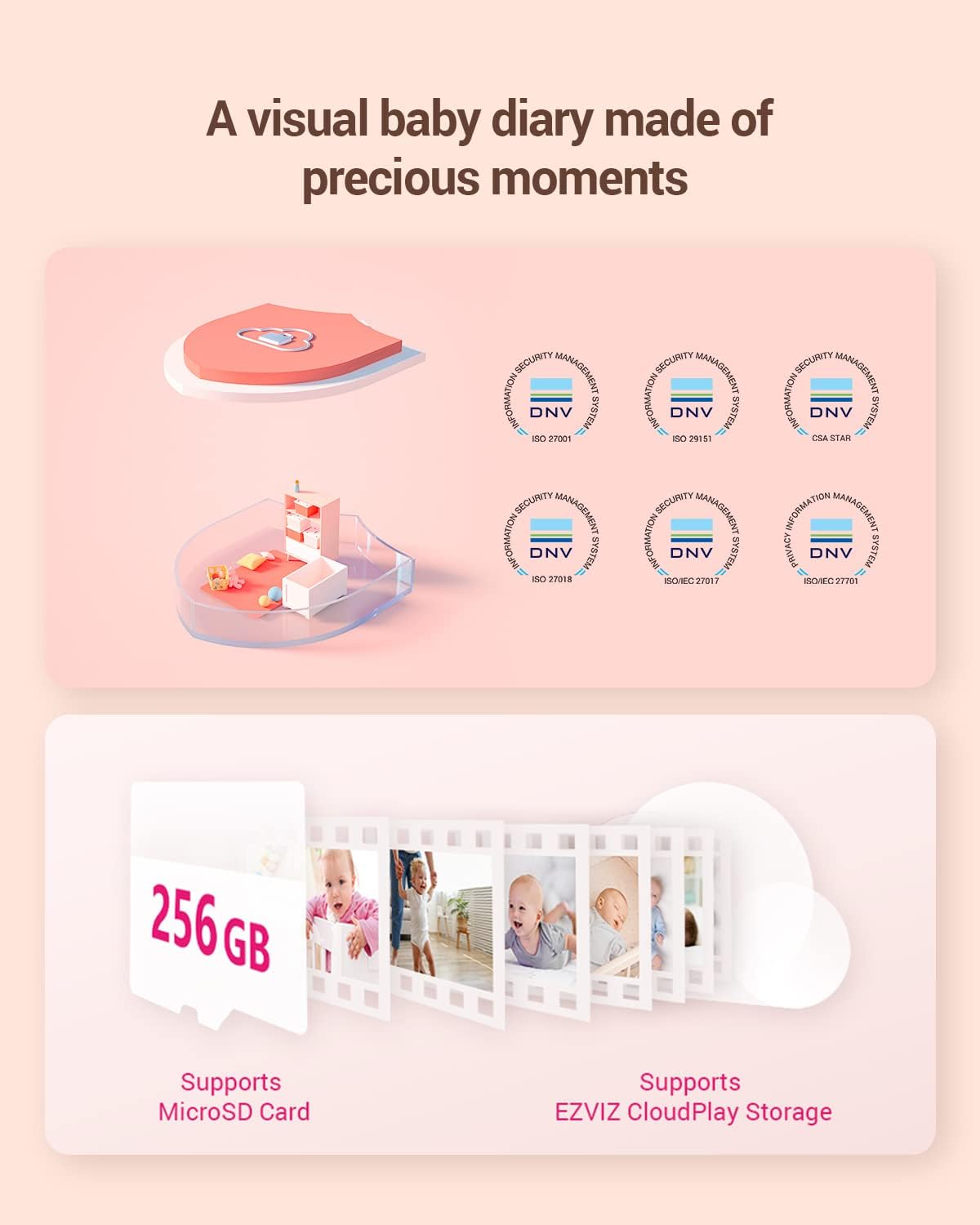 - Flexibler Speicher - Das Babyphone ist mit einem MicroSD-Kartensteckplatz ausgestattet, der bis zu 256 GB unterstützt. Wenn zusätzliches Backup erforderlich ist, sind auch abonnementbasierte, aber nicht obligatorische Cloud-Speicheroptionen verfügbar.