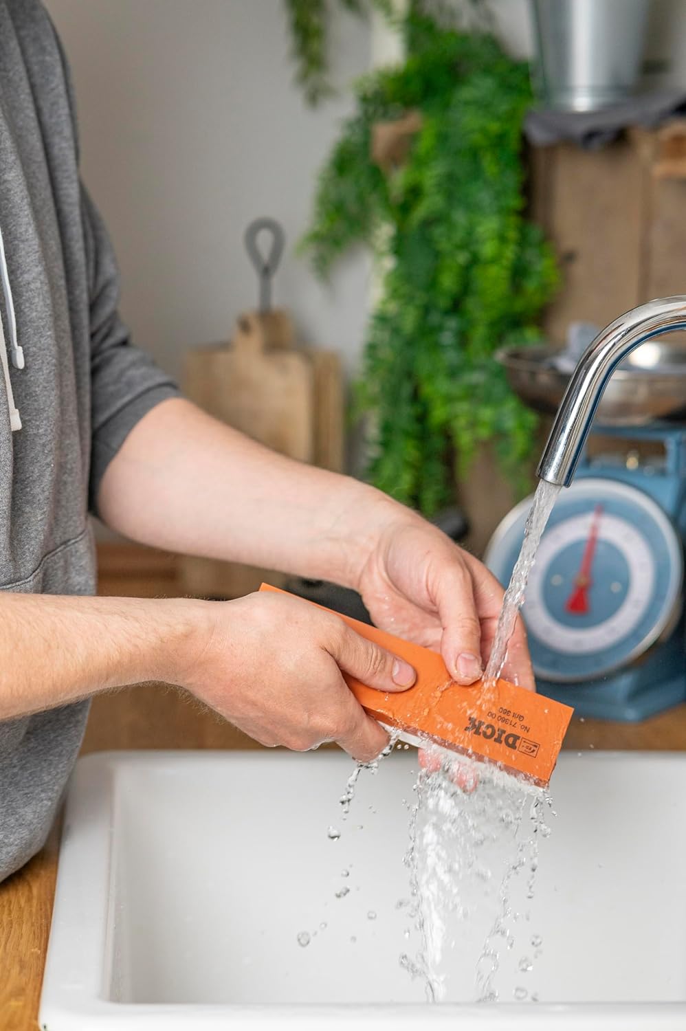 - Die orangene Seite (360 Korn) wird als erstes, zum Herausschleifen von Unebenheiten und zum Nachschärfen verwendet