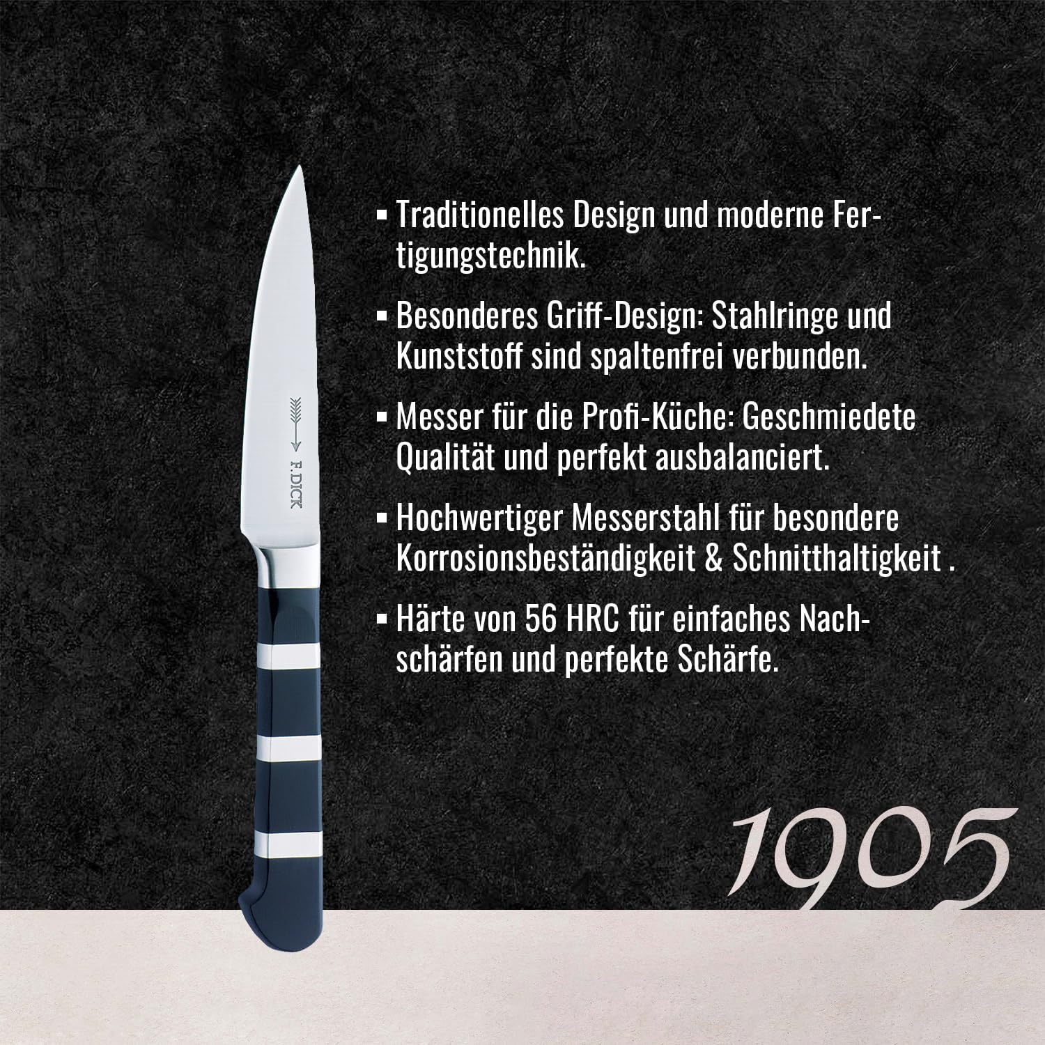 - Die Klinge besteht aus der Legierung X 50 Cr Mo V15. Jede einzelne Komponente hat eine spezielle Aufgabe: Chrom (Verschleissfestigkeits), Molybdän (Korrosionsbeständigkeit), Kohlenstoff (Festigkeit)