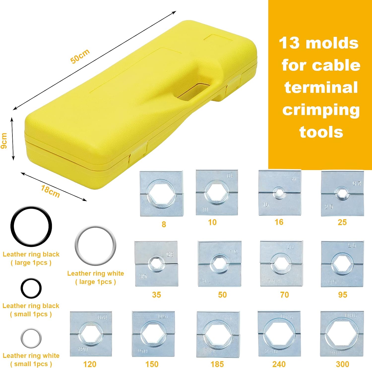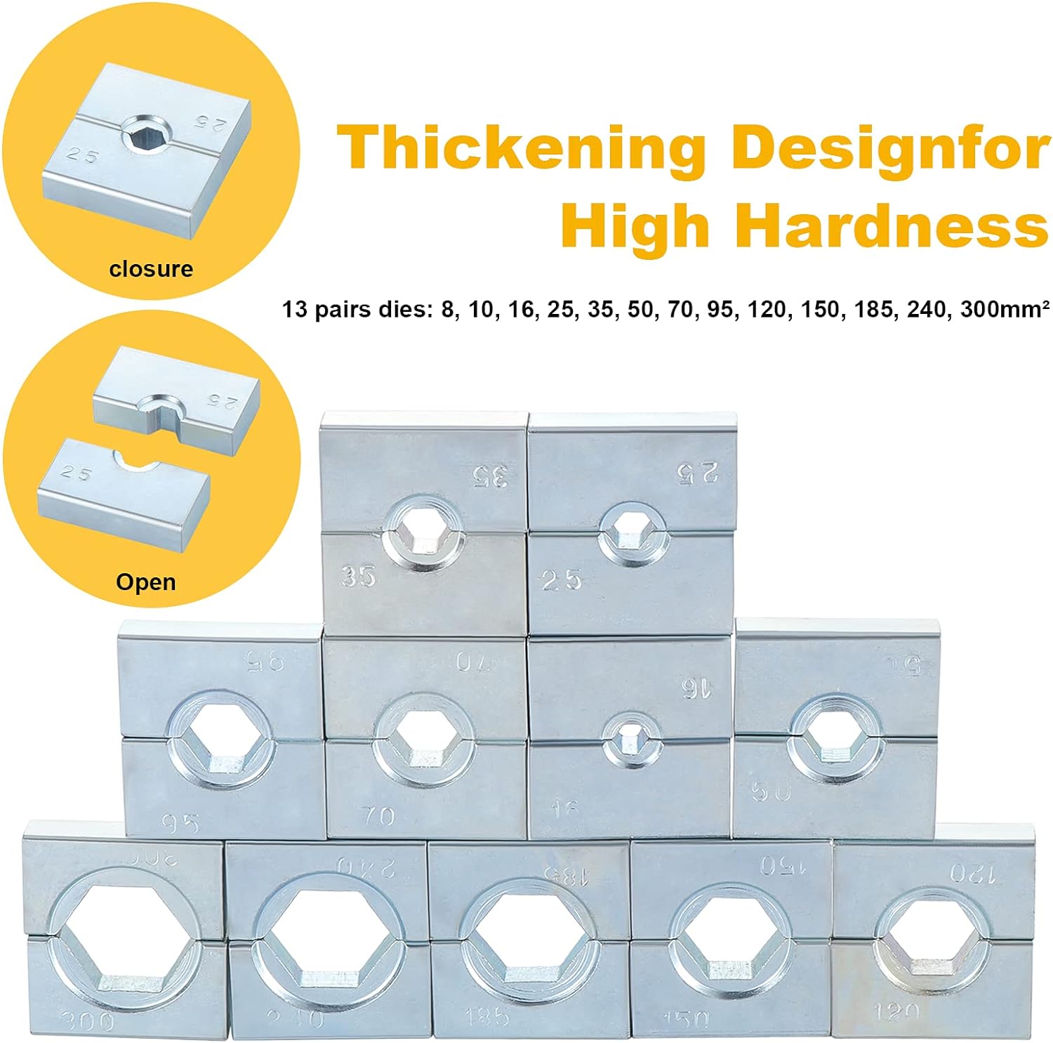 • 🥇【Haltbarkeit und Sicherheit】:Hydraulische presswerkzeug hergestellt aus langlebigen Materialien mit hoher Festigkeit und guter Zähigkeit. Hydraulik Zange Kit enthält ausserdem 13 Paar Crimpformen aus gehärtetem Stahl mit Chrom-Finish. Es hat