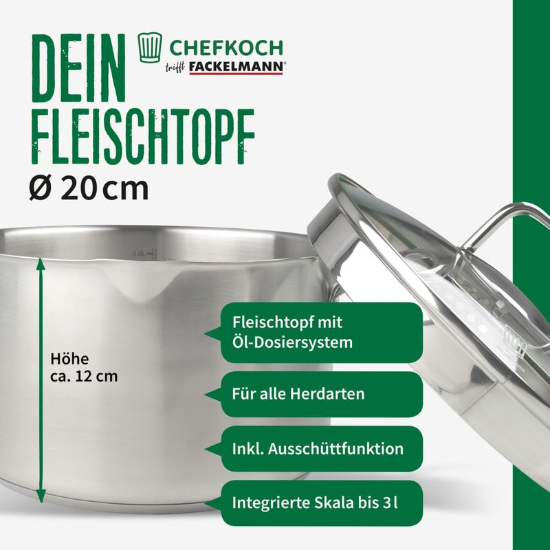 FACKELMANN Chefkoch Topf Ø20 cm München aus Edelstahl – Hochwertiger Kochtopf Ausschüttfunktion – Fü