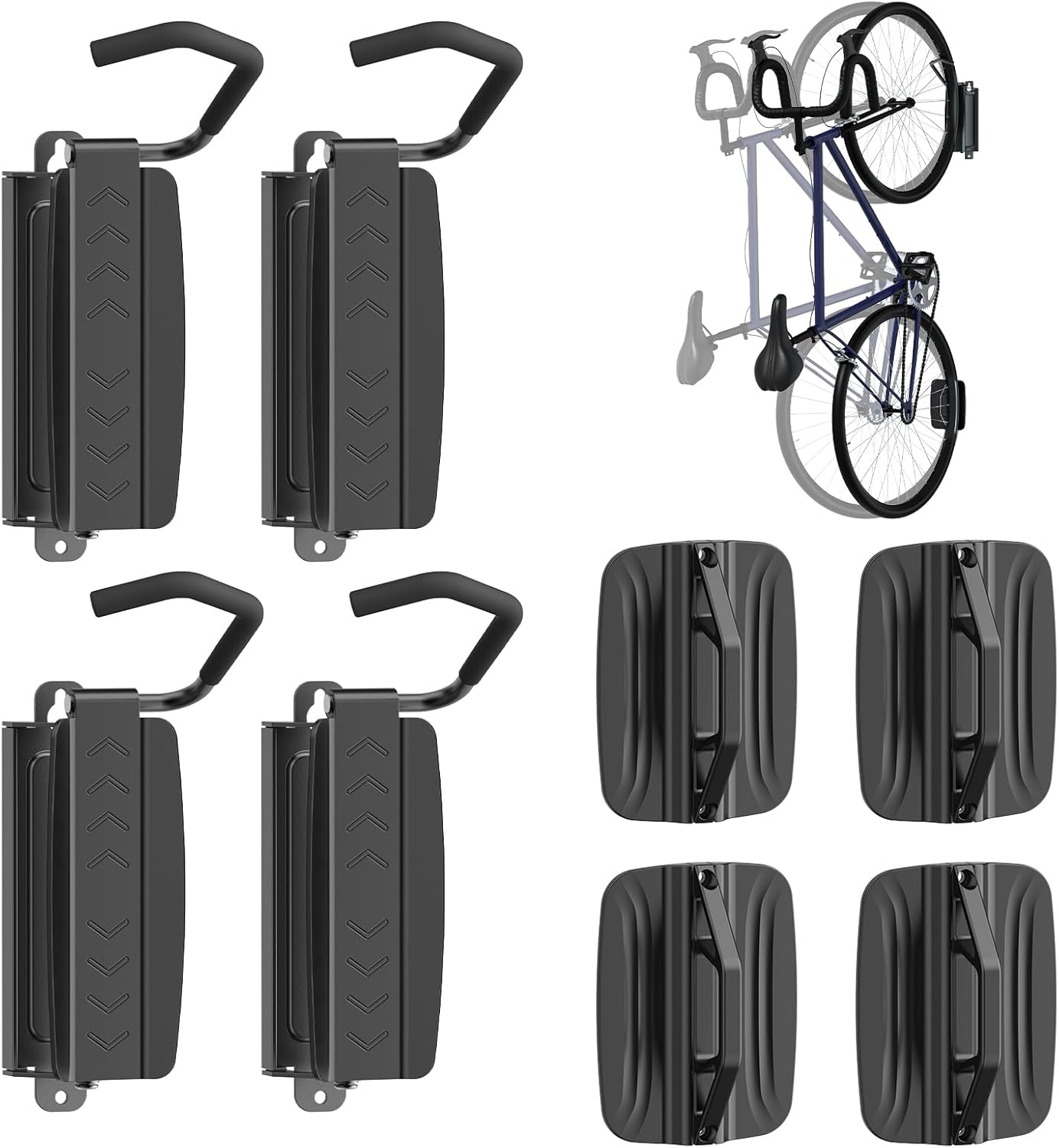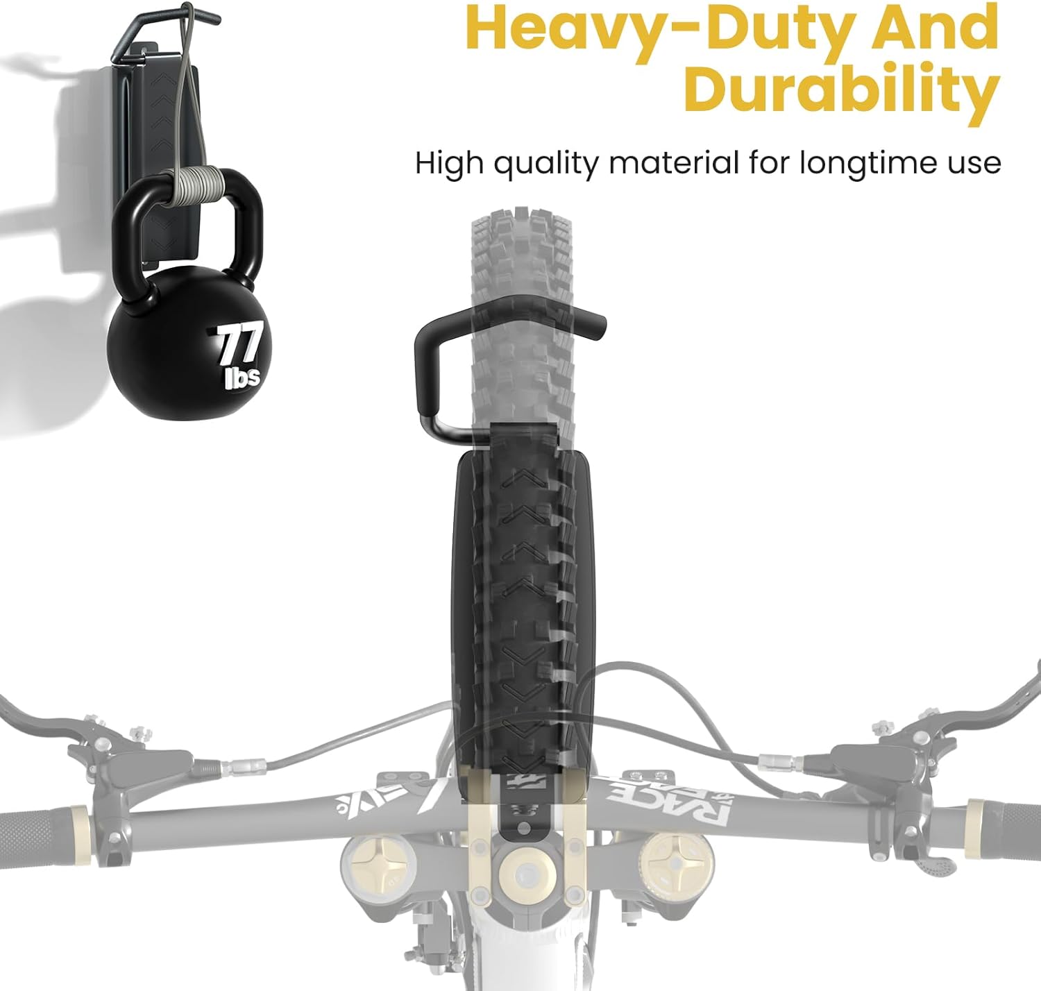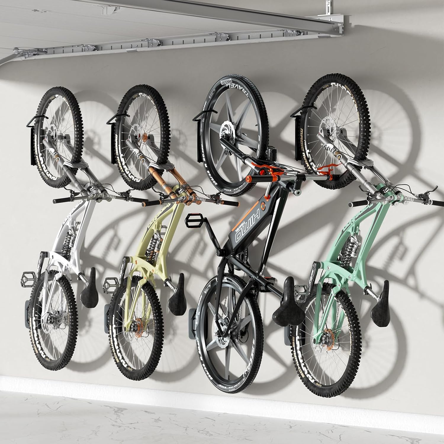 - Einfaches Aufhängen:Die Haken haben eine kratzfest beschichtete Oberfläche und sind mit einem bestimmten Neigungswinkel versehen, der keine Kratzer hinterlässt.Sie können die Vorderräder einfach in die Haken schieben, nachdem Sie die Hinterräder