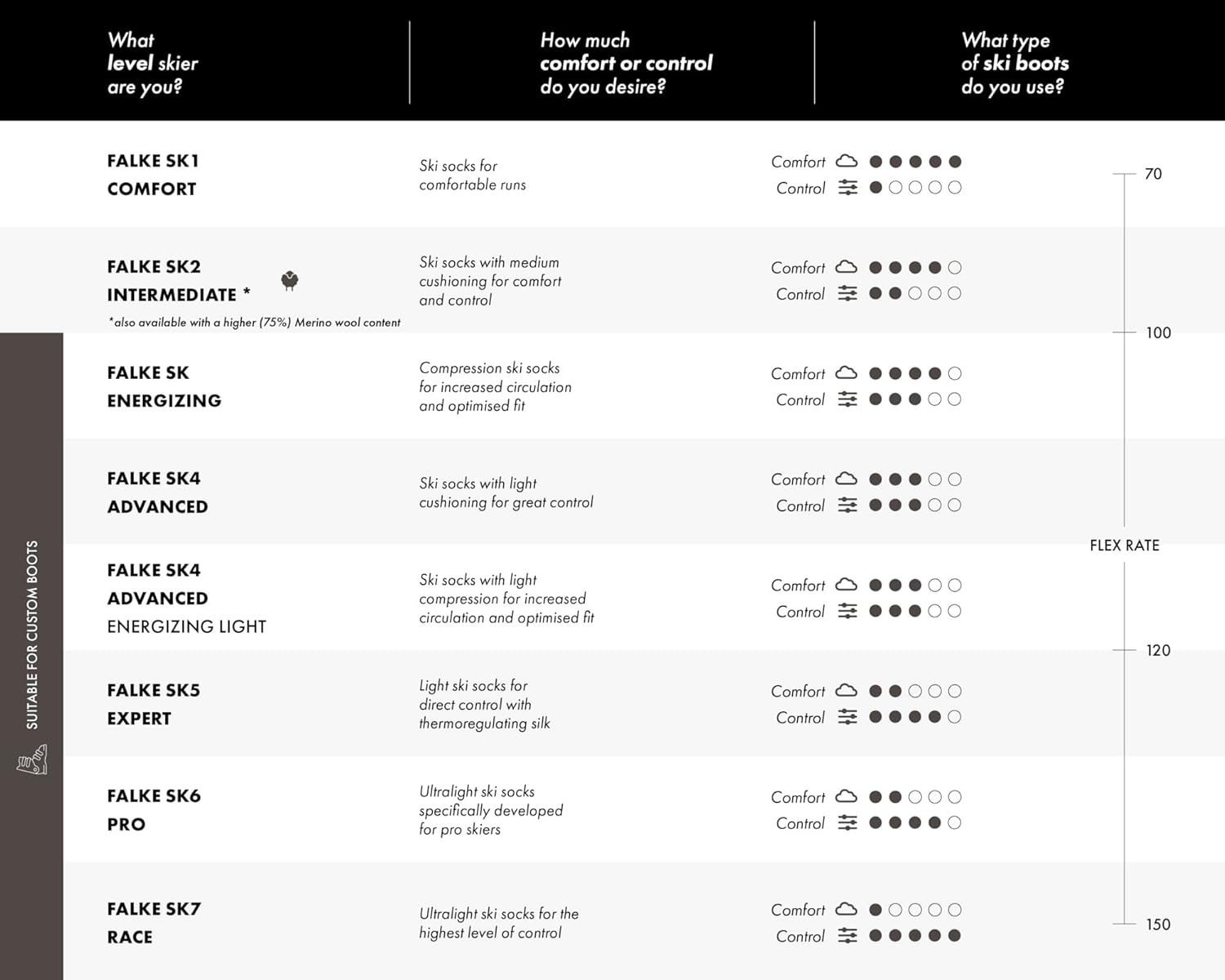 • Zur Vermeidung von Druckstellen und für besten Tragekomfort beim Wintersport endet der Skistrumpf über dem Stiefelrand; für faltenfreien Sitz empfehlen wir bei Zwischengrössen die kleinere Grösse