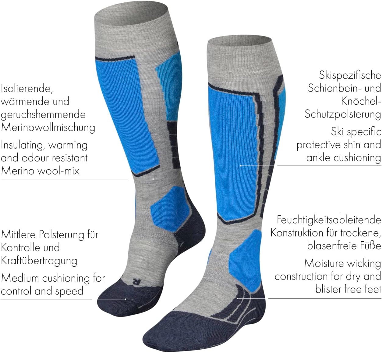 • Skisocken aus schnelltrocknendem Funktionsmaterial und isolierender Merinowolle für gute Wärmeisolation; die feuchtigkeitsableitenden 3 Lagen Konstruktion hält Ihre Füsse trocken und blasenfrei