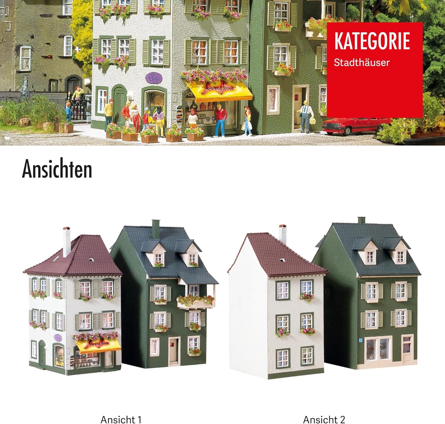 - ZWEI MEHRSTÖCKIGE WOHNHÄUSER: Die zwei mehrstöckigen FALLER Wohnhäuser in unterschiedlichen Farbgestaltungen, sieht man in dieser Ausführung oft in deutschen Städten