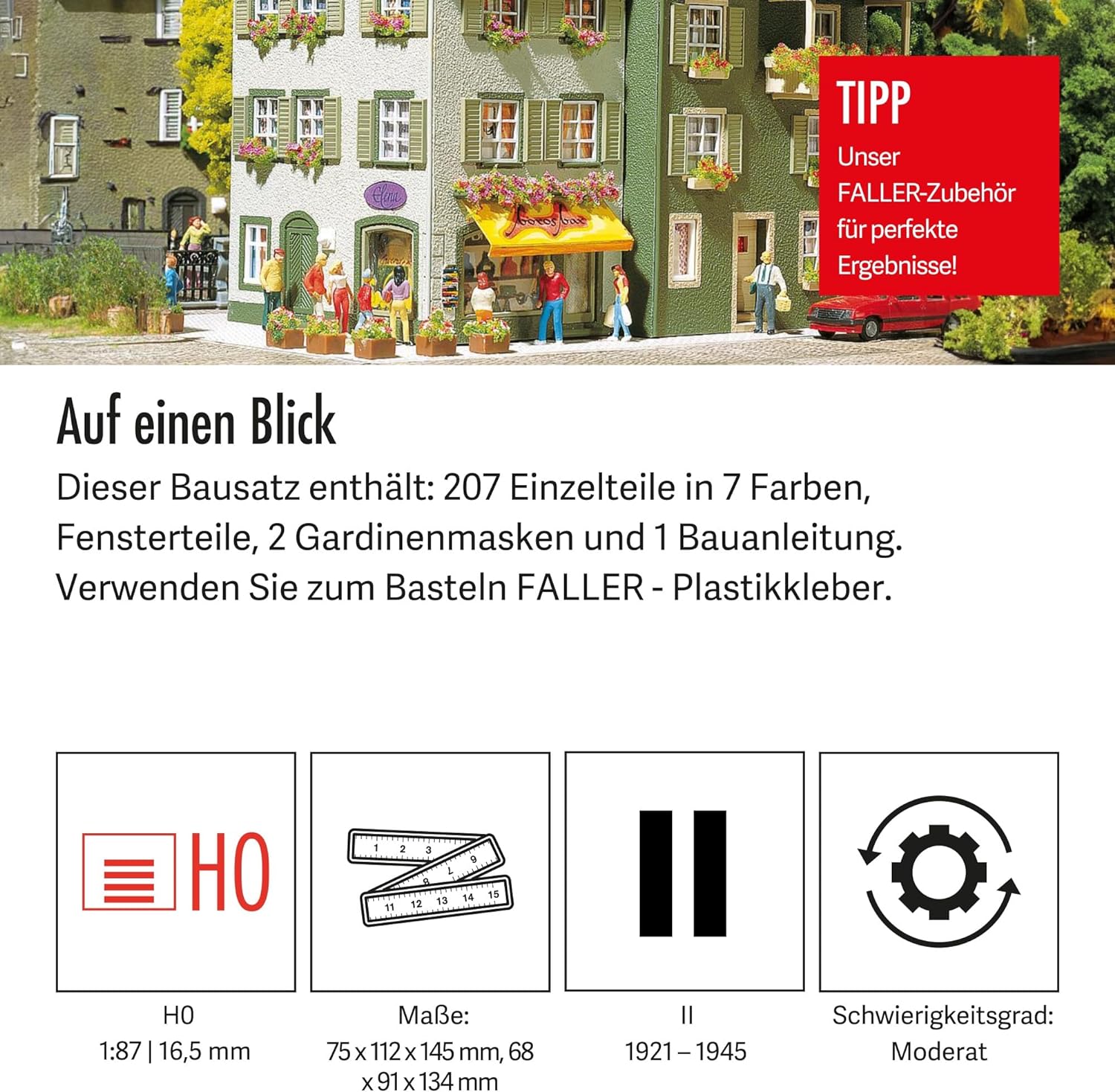 - BAUSATZ INHALT: Der FALLER Bausatz enthält: 207 Einzelteile in 7 Farben, 2x Gardinenmasken & 1x Bauanleitung. Mit Beleuchtung/Elektrik erweiterbar. Verwenden Sie zum Basteln den FALLER-Plastikkleber