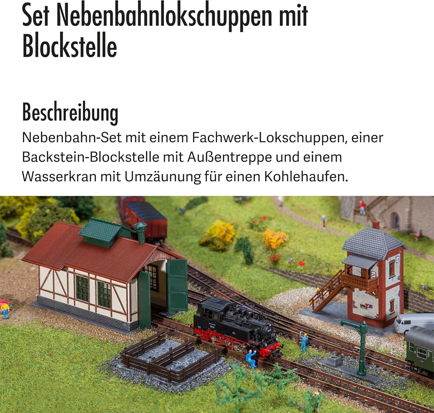 - TEILGEALTERTES NEBENBAHN-SET : Das FALLER Nebenbahn-Set bestehend aus einem Fachwerk-Lokschuppen, einer Backstein-Blockstelle mit Aussentreppe sowie einem Wasserkran mit Umzäunung für einen Kohlehaufen, hat die Spurweite N