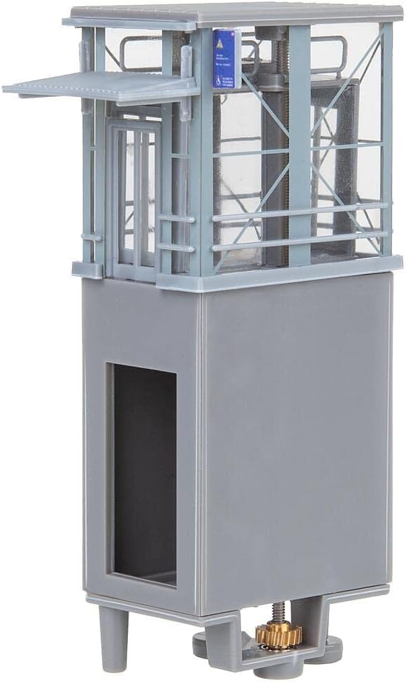 - In Stahl und Glas konstruierter Schacht mit beweglichem Aufzug für die Darstellung eines ebenerdigen Fahrstuhlzugangs auf einem Bahnsteig oder Flachdach. Antriebsteile für den Aufzug (Gewindestange, Muttern, Kugellager) sind im Bausatzumfang enthalten.