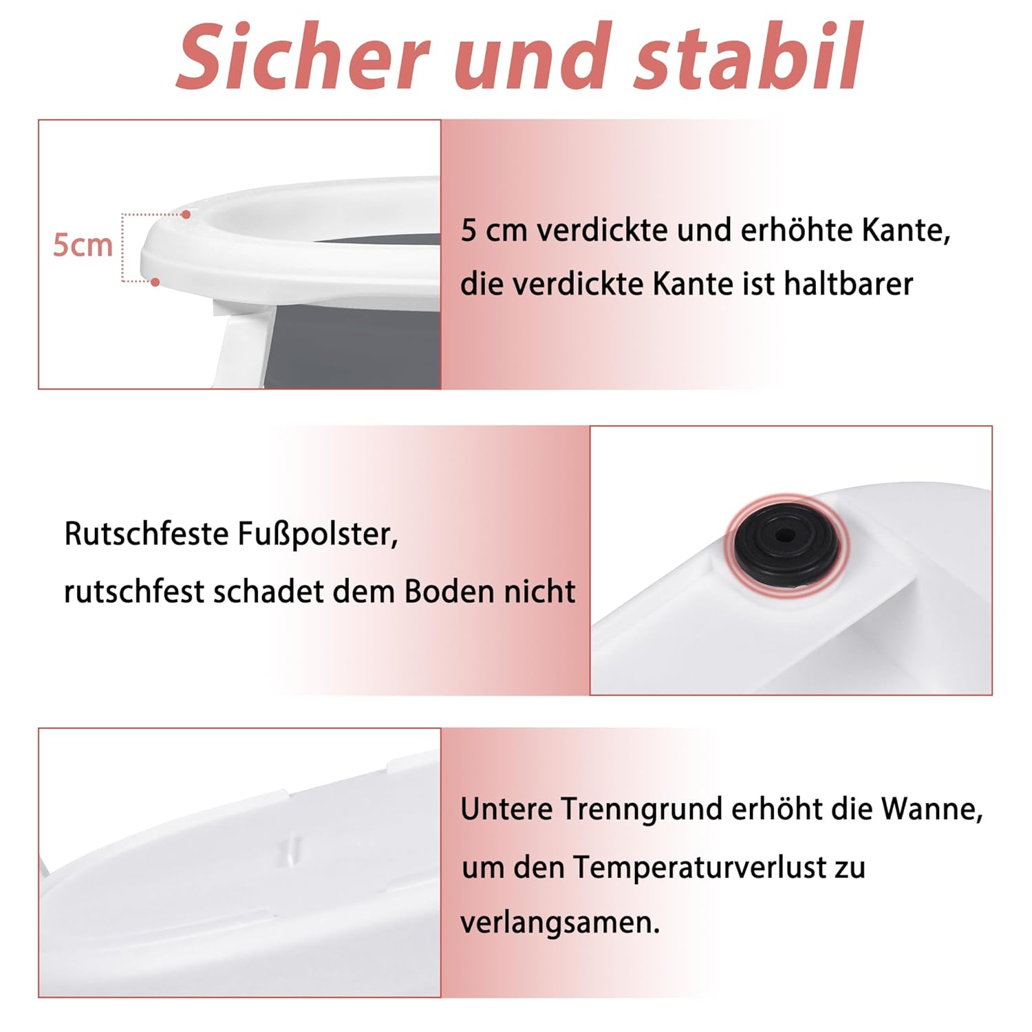 - đăSicher und stabilă Es ist 5 cm verdickter und erhöhter Rand, der verdickte Rand ist langlebiger, rutschfeste Fusspolster, rutschfest schadet dem Boden nicht, der untere Separator erhöht die Wanne, um den Temperaturverlust zu