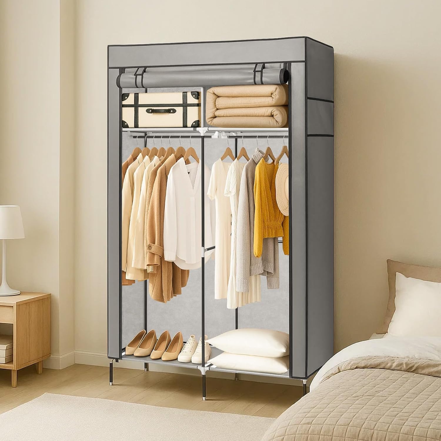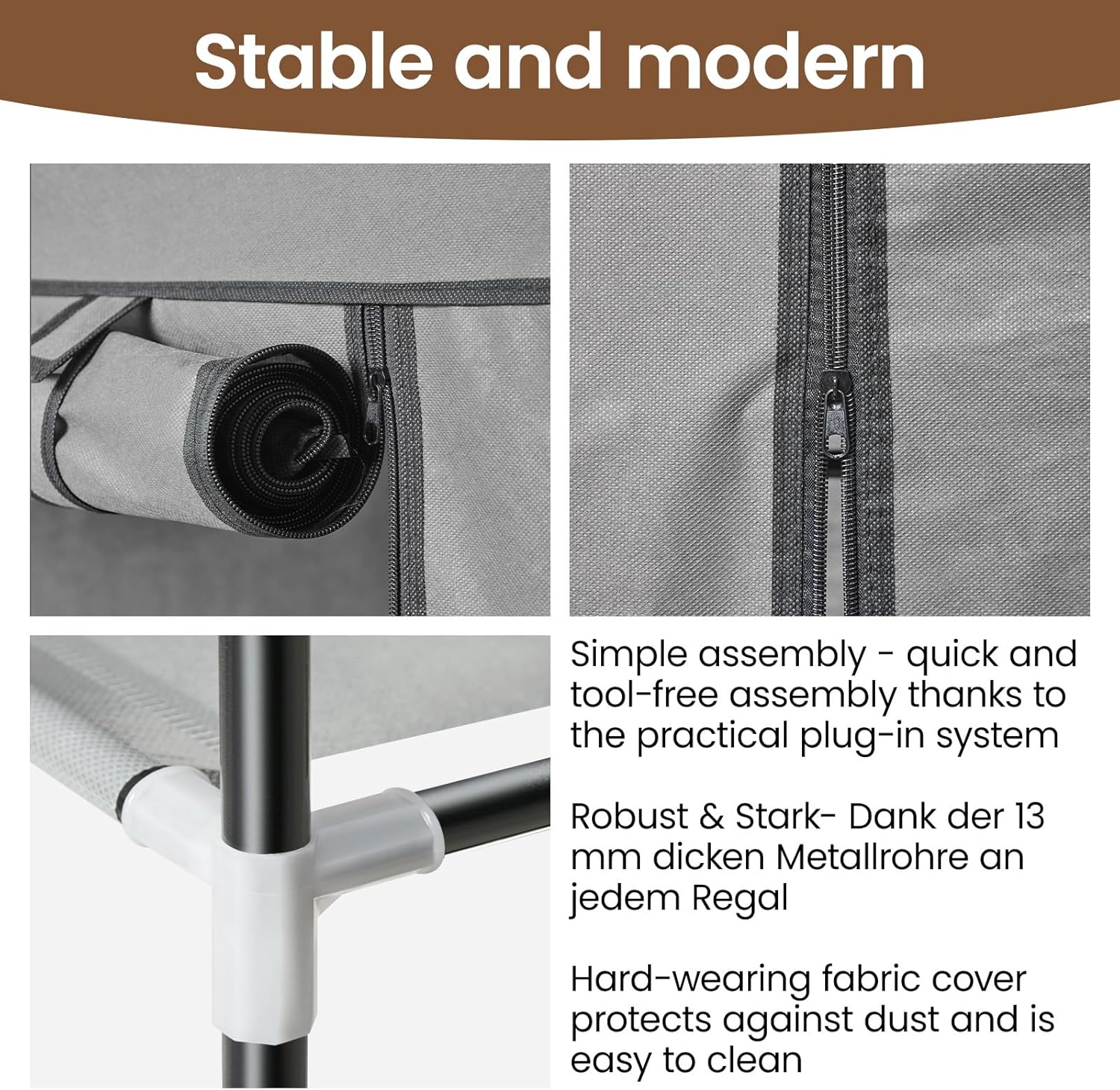 - Praktisches Design mit Reissverschluss: Der Stoffschrank ist mit einem glatten Reissverschluss ausgestattet, der ein einfaches Öffnen und Schliessen ermöglicht. Ihre Kleidung, Schuhe und Textilien werden zuverlässig vor Staub und Schmutz geschützt.