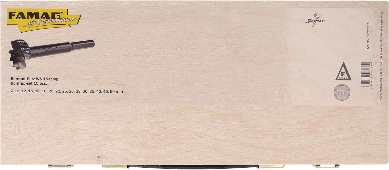 - 15-teiliger Bormax WS-Bohrersatz im Holzkasten mit D=10,12,15,16,18,20,22,25,26,28,30,35,40,45,50mm