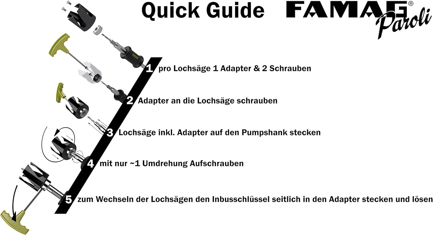 - Inklusive einem HSS-Vorbohrer und drei Adaptern - mittelhilfe des Adapters kann der PUMPSHANK auf einer Vielzahl von Lochsägen montiert werden