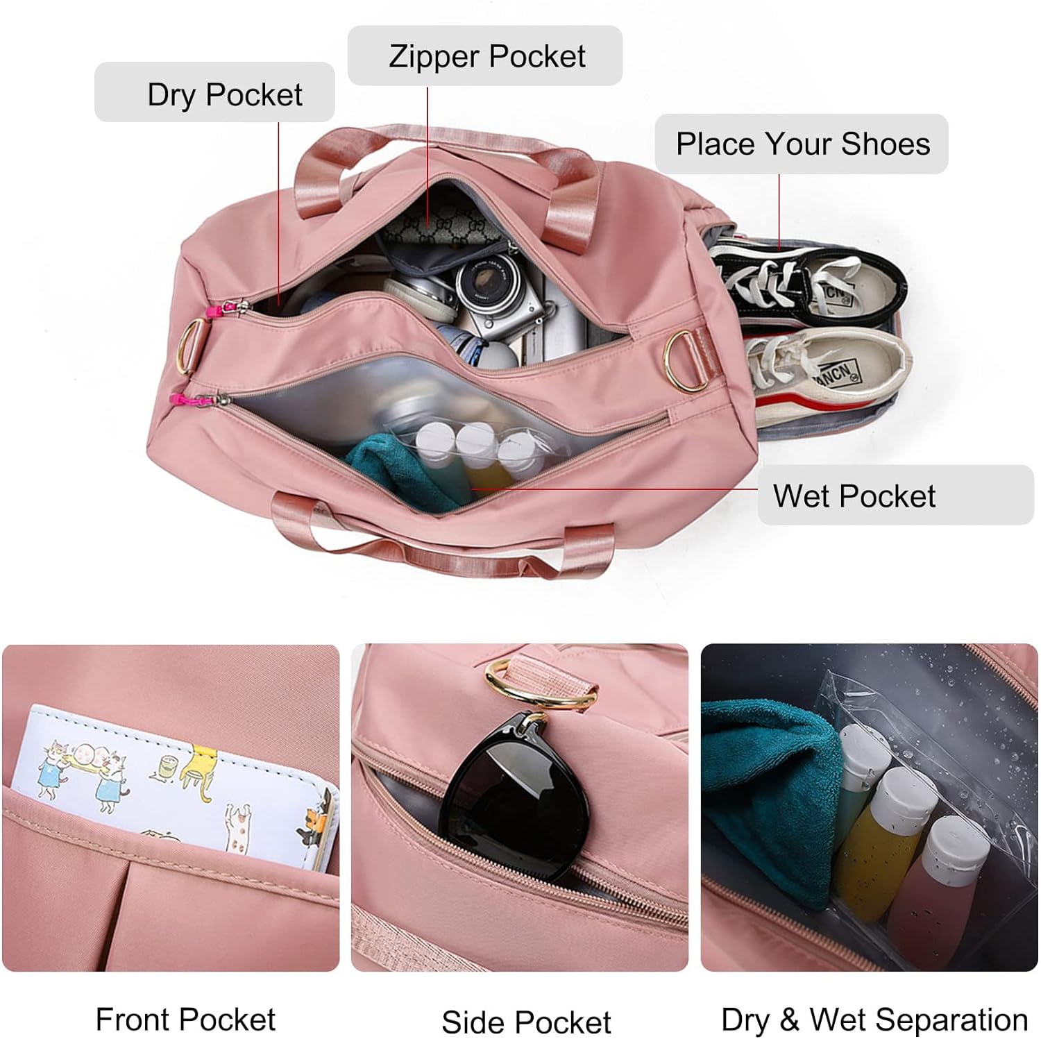 - 【Wochenendbeutel über Nacht】 Drei Schicht: Haupttasche + Wet- und Trockenabteilungstasche + unabhängiger Schuhfach. Mehrere Taschen haben genügend Platz, um nasse Handtücher, Toilettenartikel, Schuhe, Kleidung und andere Reisebedürfnisse zu