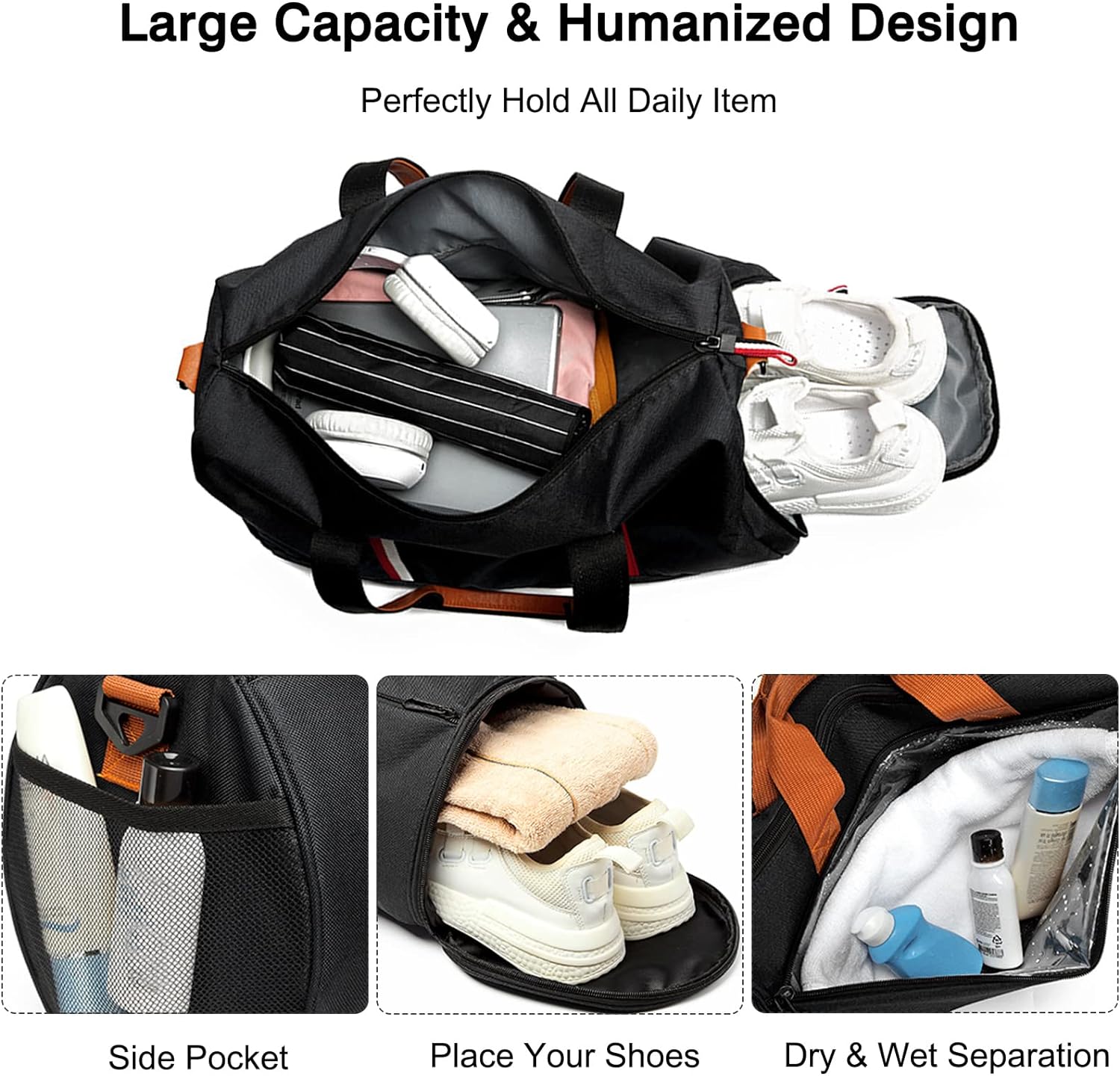 • ✅ 【Sporttasche für Frauen】Grösse: 42x22x22cm. Tasche: Hauptkapazität Tasche vorne Trocken und nass getrennt Tasche seitliches Schuhfach. Diese Sporttasche für Frauen und Männer kann Laptop, Handtücher, Kosmetika, Tablet, Kleidung, Essen,