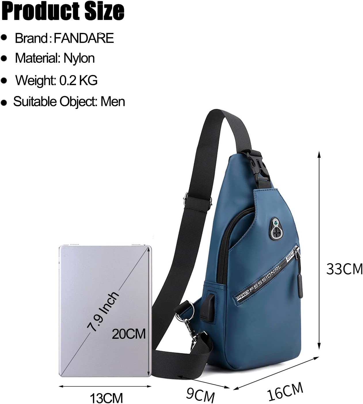PRODUKTBESCHREIBUNGEN FANDARE Männer Brusttasche Ultraleichte Umhängetasche Abmessung: 16x9x33cm(Länge x Breite x Höhe); Gewicht: 0.2KG Gut organisierte Fächer - Unsere Tasche ist gut unterteilt und hat mehrere Taschen. Kapazität: Haupttasche+Vordere Reissverschlusstasche+ vordere Schnallentasche+ hintere Tasche Hauptfach - Ermöglicht die Aufbewahrung von 7,9-Zoll-Tablet, Telefon, Geldbörse, Schlüssel, Lippenstift, Papiertuch, Feuchttücher und so weiter, was ein praktischer Begleiter für die Aufbewahrung von Reiseutensilien ist. Vordertasche - Eine Zubehörtasche auf der Vorderseite bietet zusätzlichen Stauraum für Gegenstände, auf die Sie schnell zugreifen müssen. Perfekte Grösse für Ihr Gadget - Unsere Hosenträger-Taschen sind zwar klein, aber geräumig und so konzipiert, dass sie eine Vielzahl von Gegenständen aufnehmen können. Unter einer leichten Jacke oder einem Mantel ist sie praktisch unsichtbar. Sehr sicher an überfüllten Orten. Bequeme & atmungsaktive & tragbare kleine Daypacks Unser Chest Pack ist aus wasserabweisendem und kratzfestem Nylon Oxford Material gefertigt, sehr haltbar und leicht. Er ist gut verarbeitet und multifunktional. Der wabenförmige, atmungsaktive Rücken- und Schultergurt ist weich und bequem und bietet Komfort, wenn Sie mehrere Gegenstände transportieren. Diese Tasche hat ein modernes Design mit dem Gefühl einer klassischen Schlinge für moderne Menschen, die viel unterwegs sind. Sie ist so gestaltet, dass sie Kreativität und Mode miteinander verbindet. Bequem & vielseitig - Der kleine Rucksack ist eine gute Wahl für überfüllte Marktplätze, Flughäfen, Busse, Züge, Sportveranstaltungen und Musikfestivals. Bestes Geschenk & Universal für alle Jahreszeiten. Service Wenn Sie irgendwelche Fragen haben, werden wir Ihr Problem gleich beim ersten Mal lösen.