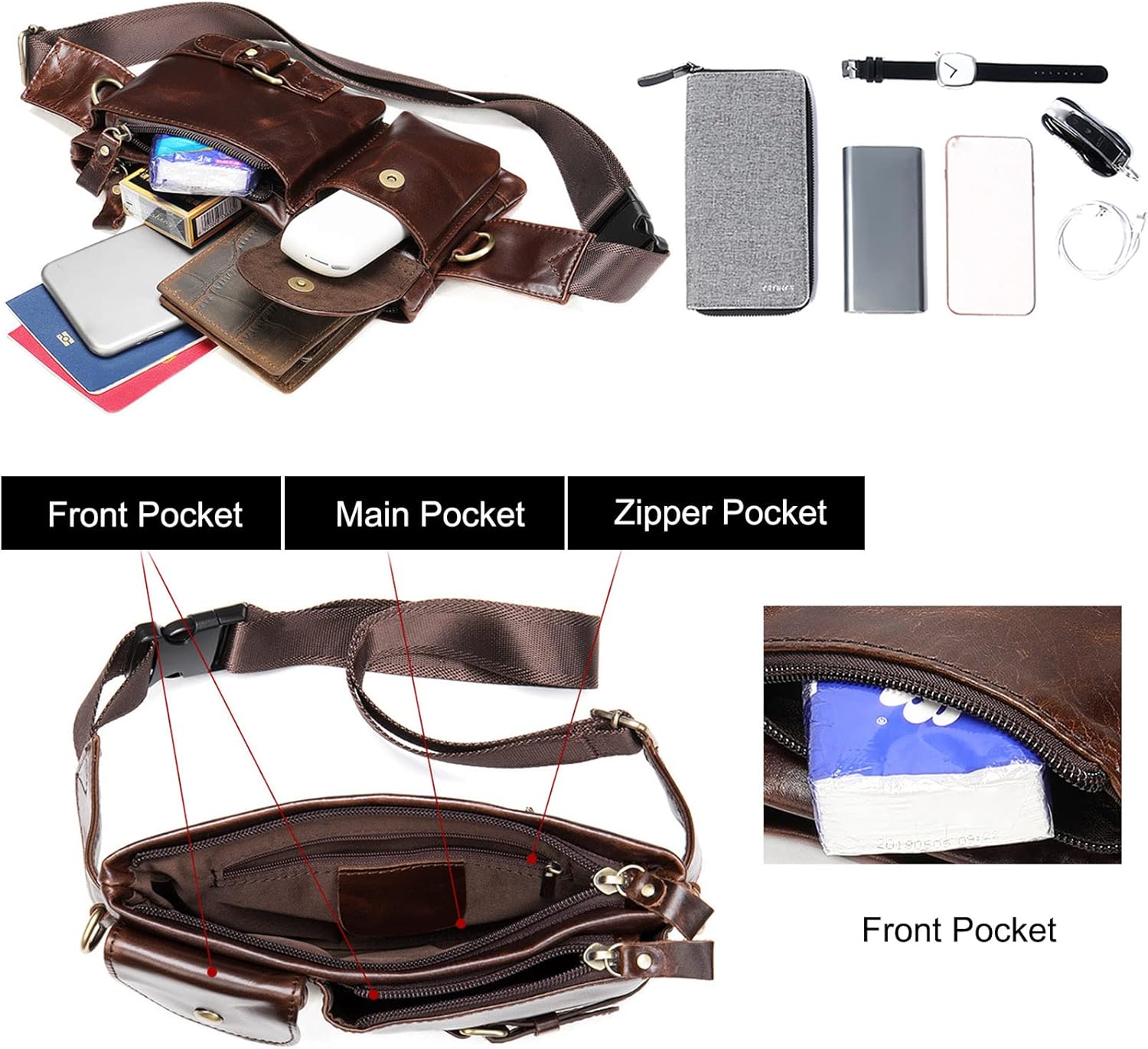 - ✔ Mehrere Taschen. Grösse: 22cm x 3cm x 12cm. Kapazität: Haupttasche+Vordere Reissverschlusstasche+Vordere Druckknopftasche+Hintere Tasche. In das grösste Fach passen Telefon, Handtuch, Hundefutter, Handy, Ausweis, Bankkarten, Bargeld, Schlüssel,