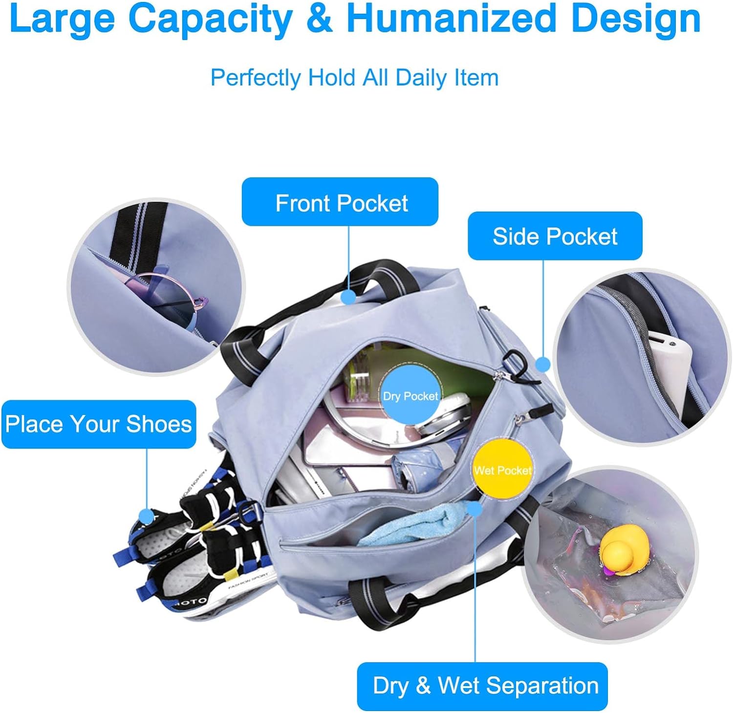 - 【Wochenendtasche für die Nacht】 Dreilagig: Haupttasche + Nass- und Trockentrenntasche + unabhängiges Schuhfach. Mehrere Taschen bieten ausreichend Platz für nasse Handtücher, Toilettenartikel, Schuhe, Kleidung und andere Reiseutensilien. Die