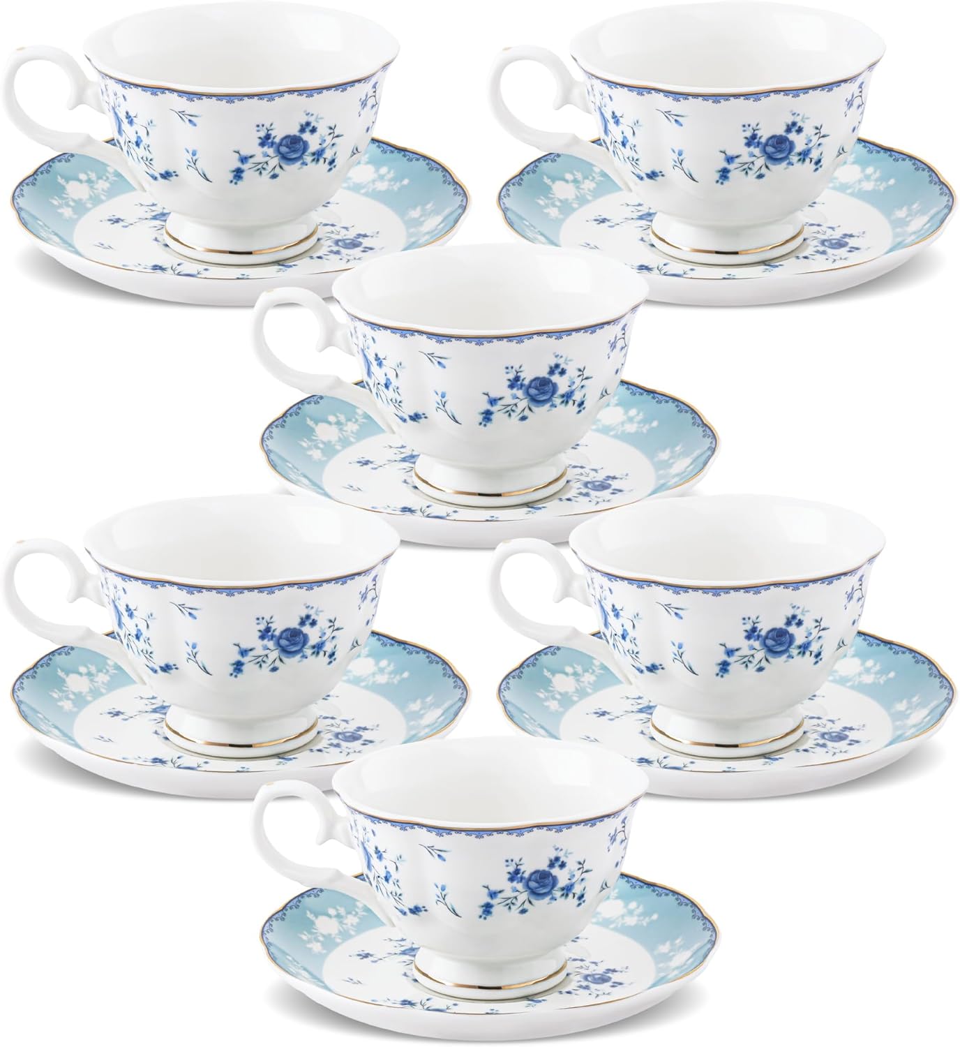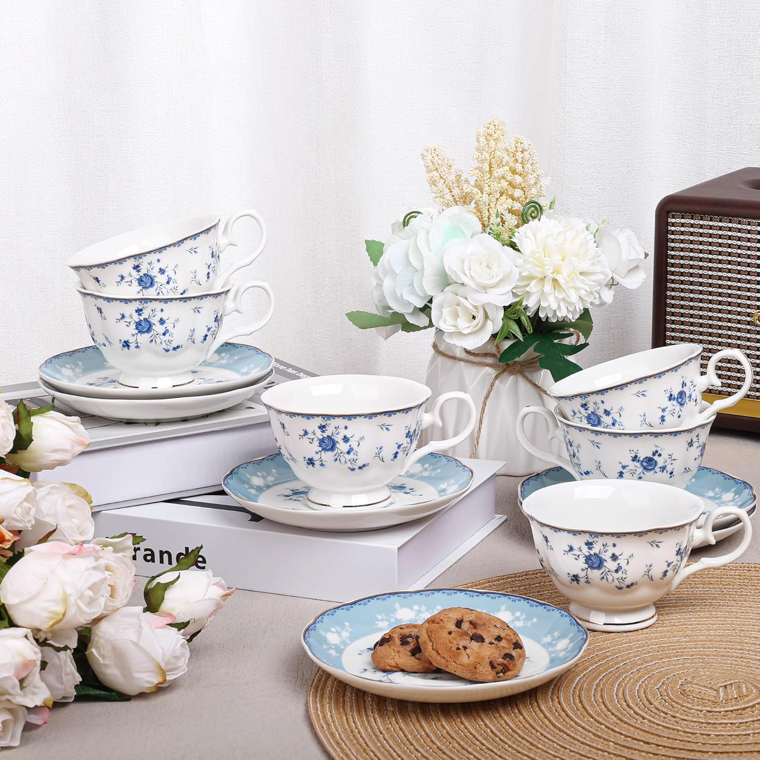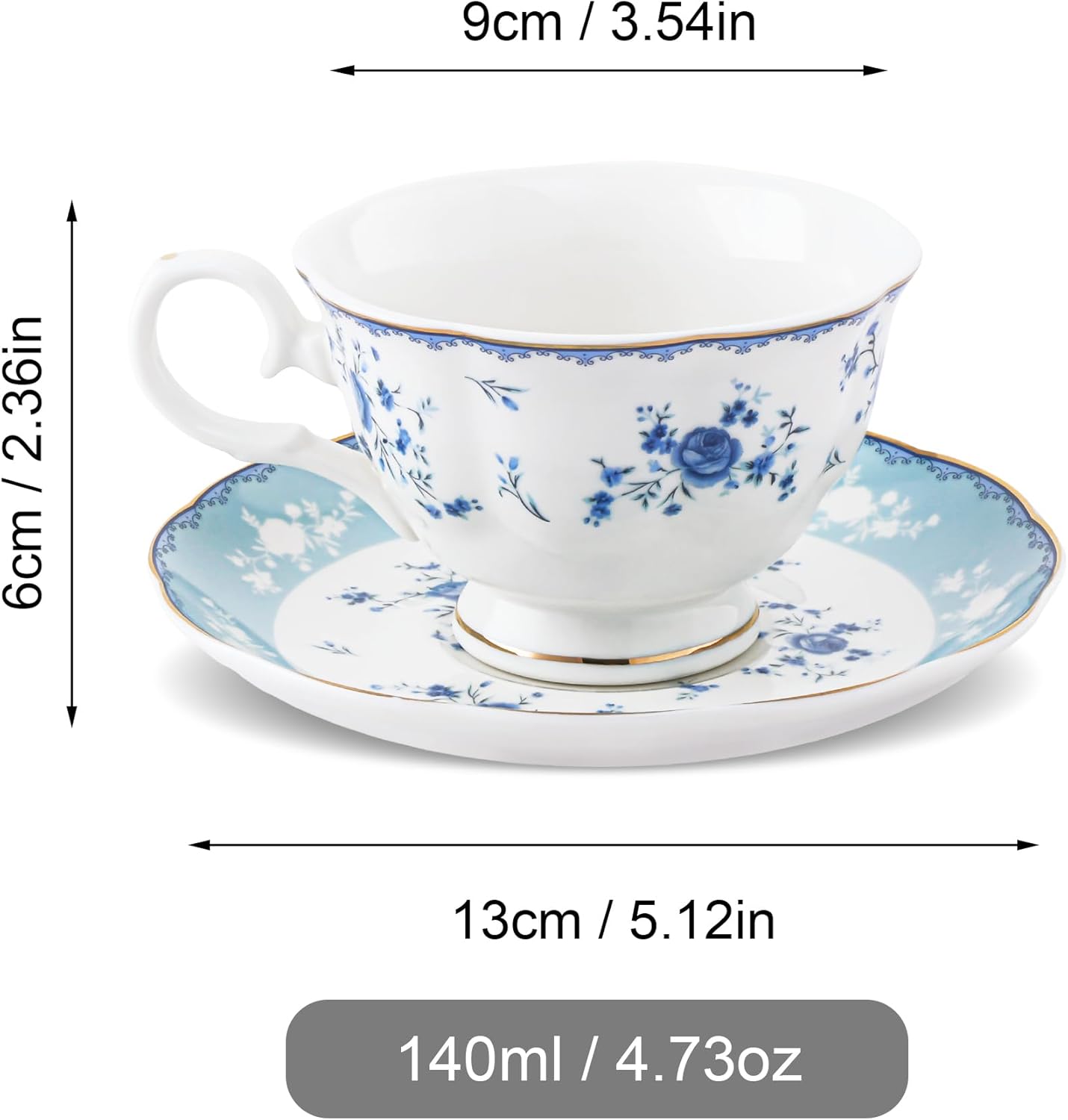 - Elegant und exquisit: Das Design der Kaffeetassen und Untertassen nimmt einen eleganten Stil mit einem britischen Design mit blauen Blumen an. Das zarte Blumenmuster verleiht ihnen ein elegantes Aussehen und sorgt für ein entspannendes Kaffee-Ambiente.