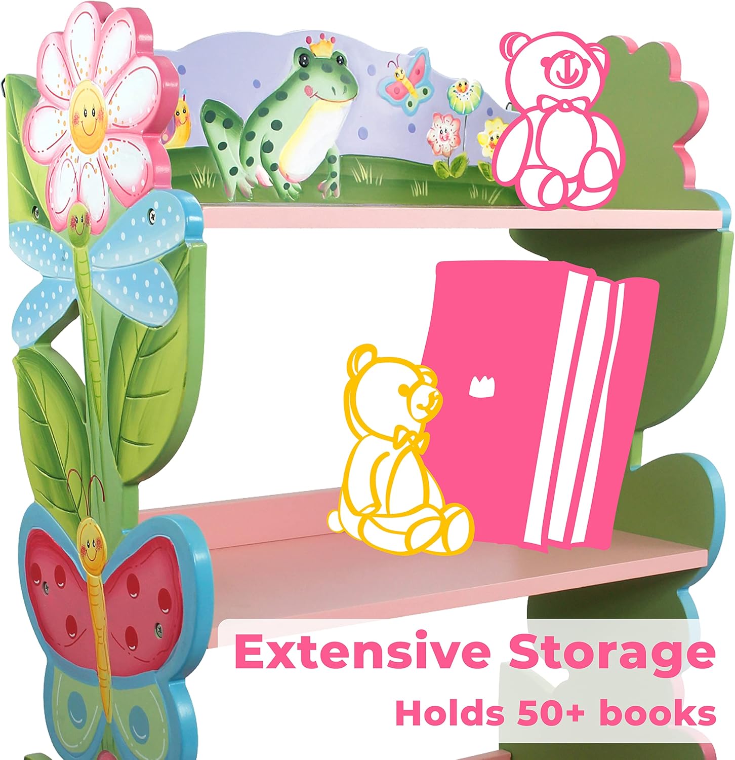 - BÜCHERREGAL FÜR KINDER: Magisches grosses Bücherregal mit Gartenmotiv und handbemalten und handgeschnitzten Tieren wie Schmetterlingen, Libellen und Hummeln. Beendet in einer hellen, heissen rosa Farbe.