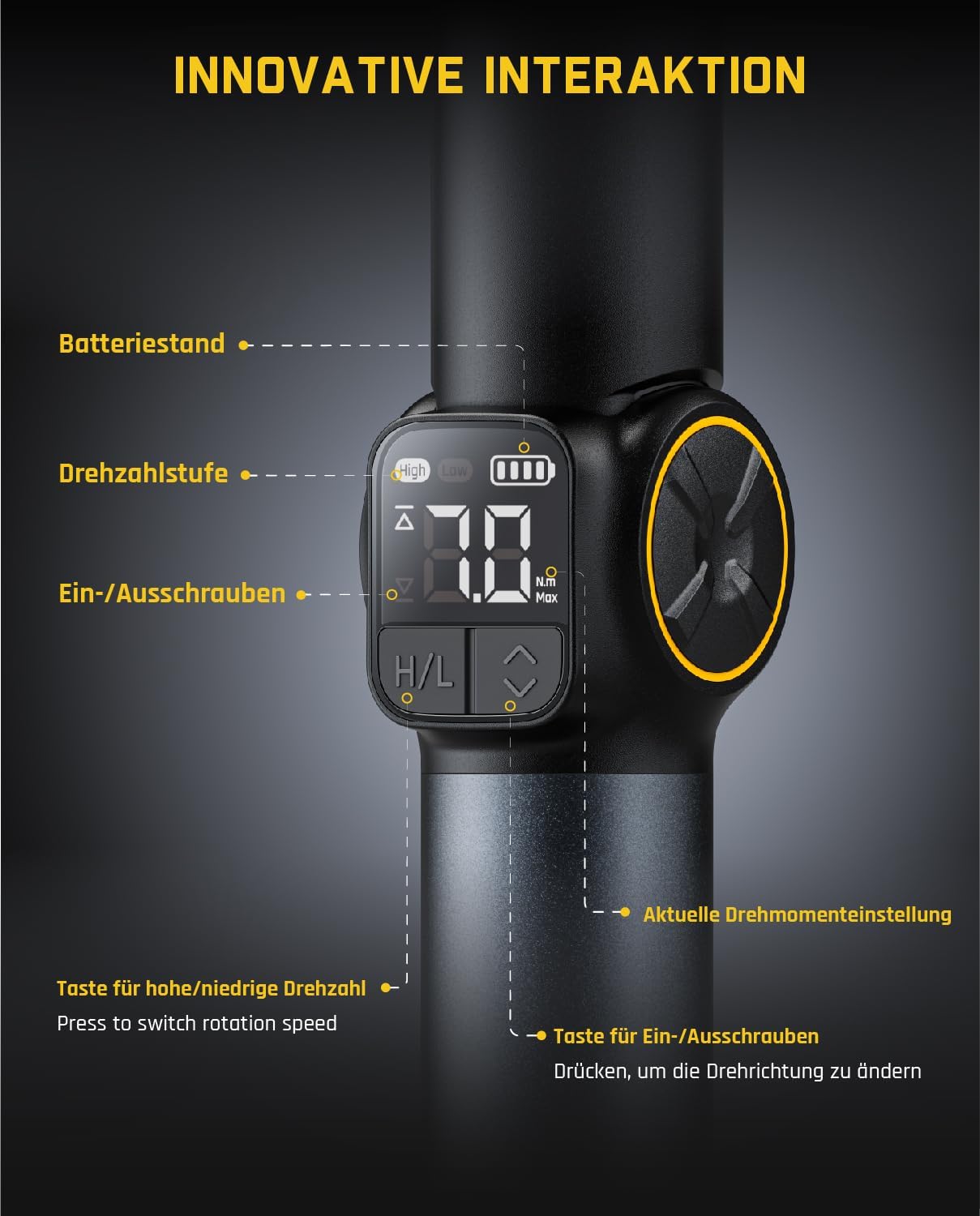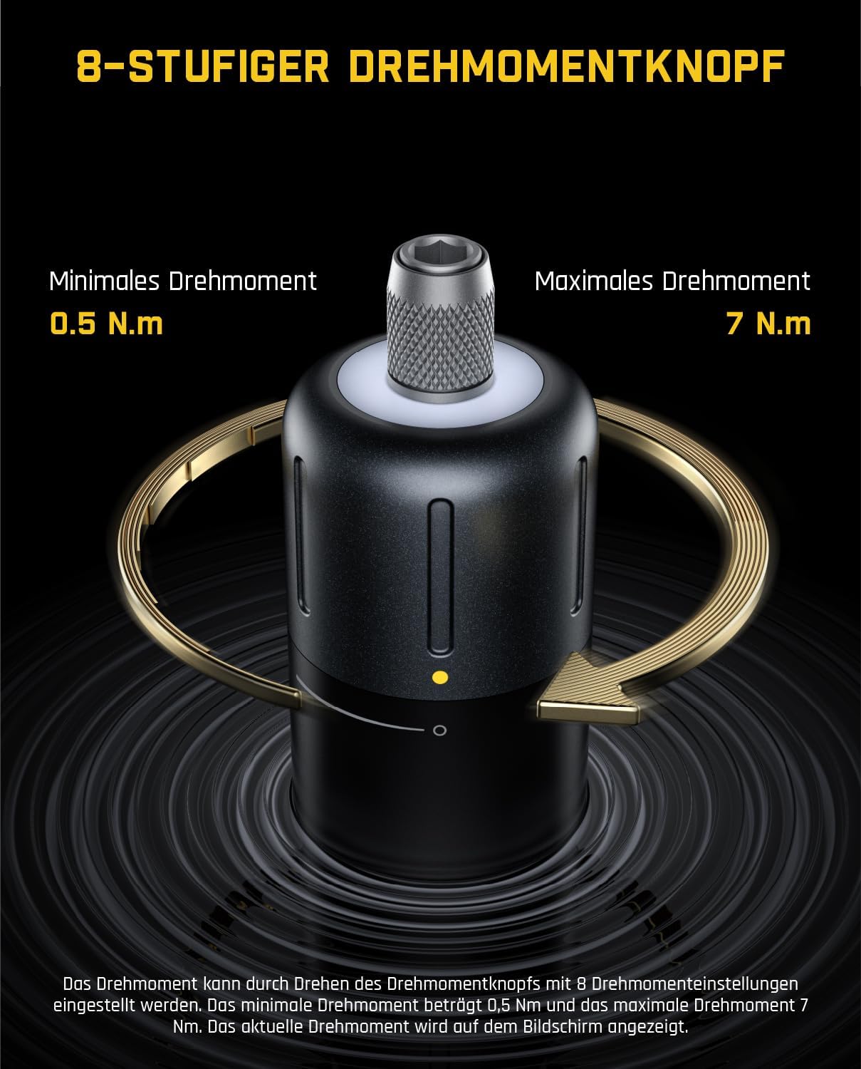 - Präzisions-Einstelldrehmoment und LED-Anzeige: Sie können das Drehmoment durch den Drehmomentring mit 8 Einstellungen einstellen, um Präzision zu gewährleisten, und die Echtzeit-Drehmomentstufen auf dem Bildschirm visuell überwachen. Dies bietet