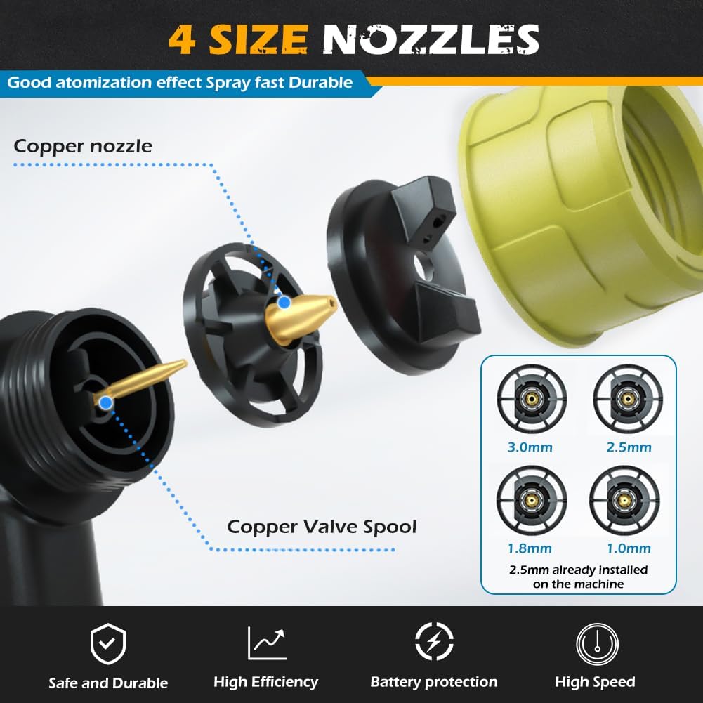- 🌈【3 Muster & 4 Düsen】- Das Honeyhouse Farbsprühsystem Set mit 4 Düsen von 1.5mm bis 2.6mm, die für verschiedene Farben angewendet werden, z.B dünne Farben, Latexfarbe und Milchfarbe. 3 Muster ermöglichen horizontalen, vertikalen und