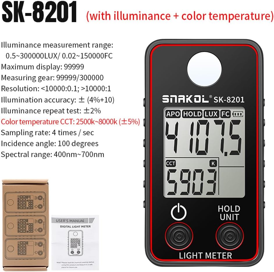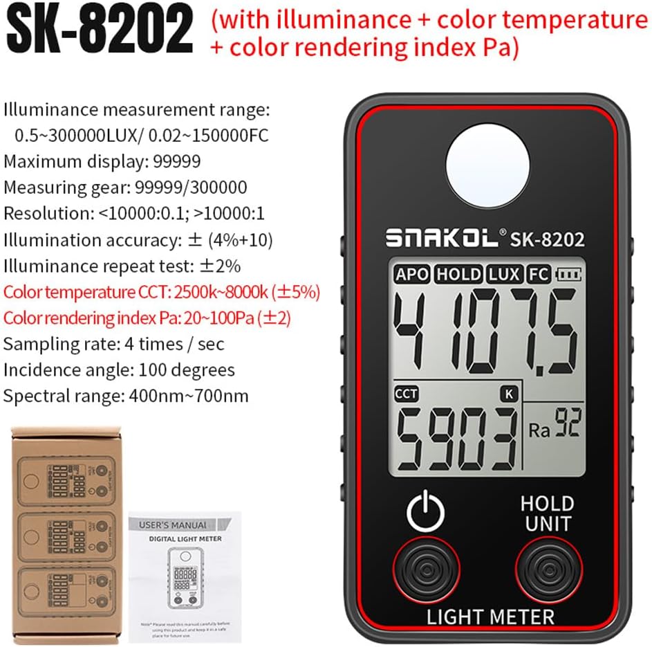 - 【Zwei Modelle optional】: Wählen Sie zwischen zwei Modellen – SK-8201 für grundlegende Beleuchtungs- und Farbtemperaturmessungen oder das verbesserte SK-8202 bietet zusätzliche CRIndex-Messungen, die Ihren spezifischen Anforderungen gerecht
