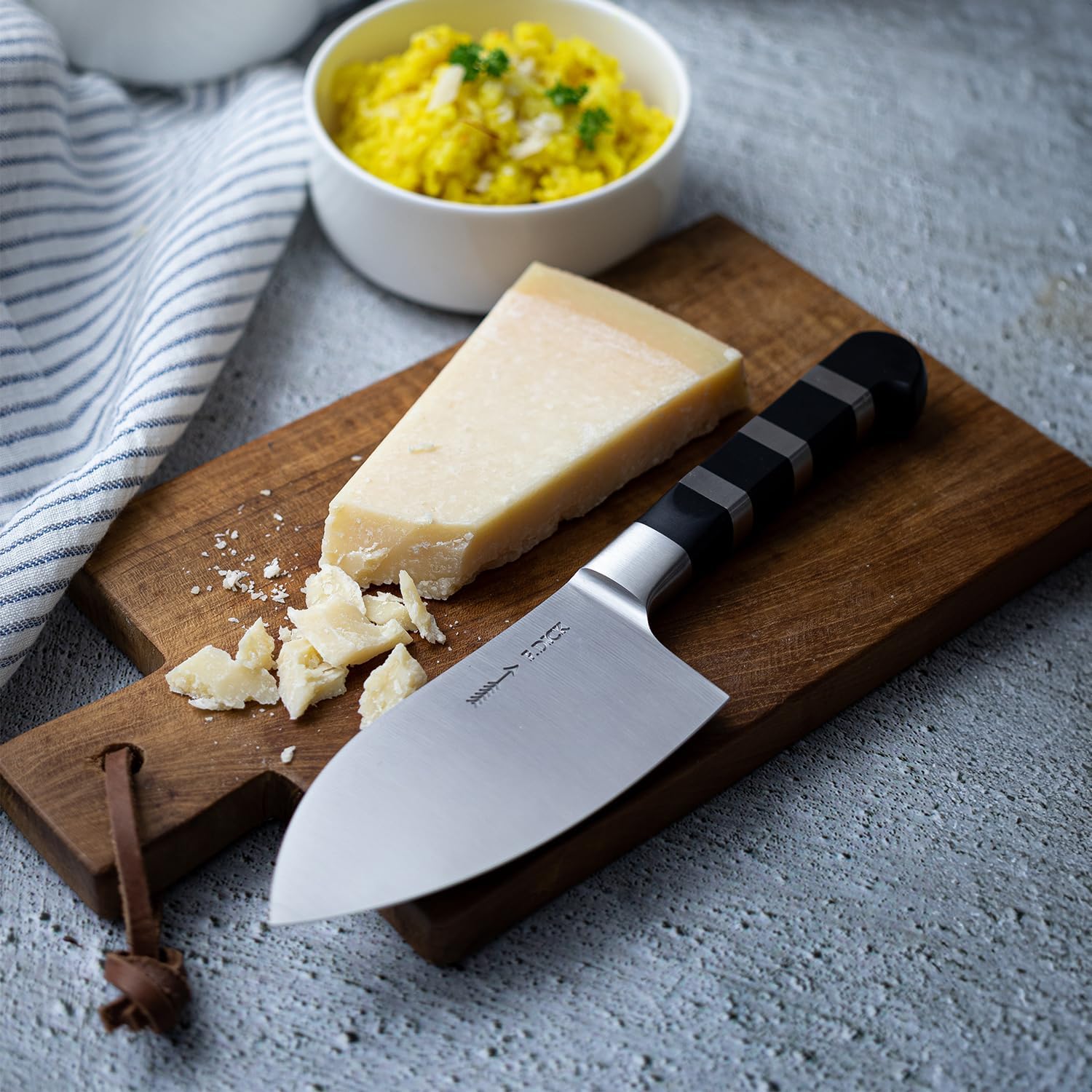 - Die Klinge besteht aus der Legierung X 50 Cr Mo V15. Jede einzelne Komponente hat eine spezielle Aufgabe: Chrom (Verschleissfestigkeits), Molybdän (Korrosionsbeständigkeit), Kohlenstoff (Festigkeit)