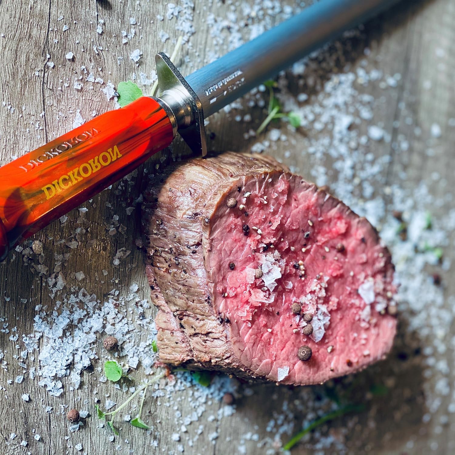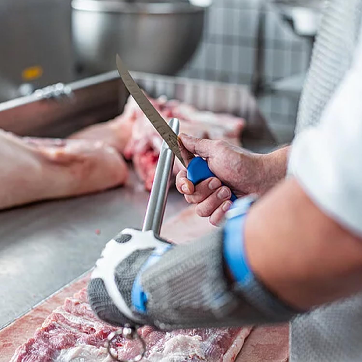 - Breite Auflagefläche des Wetzstahls durch ovale Klingenform