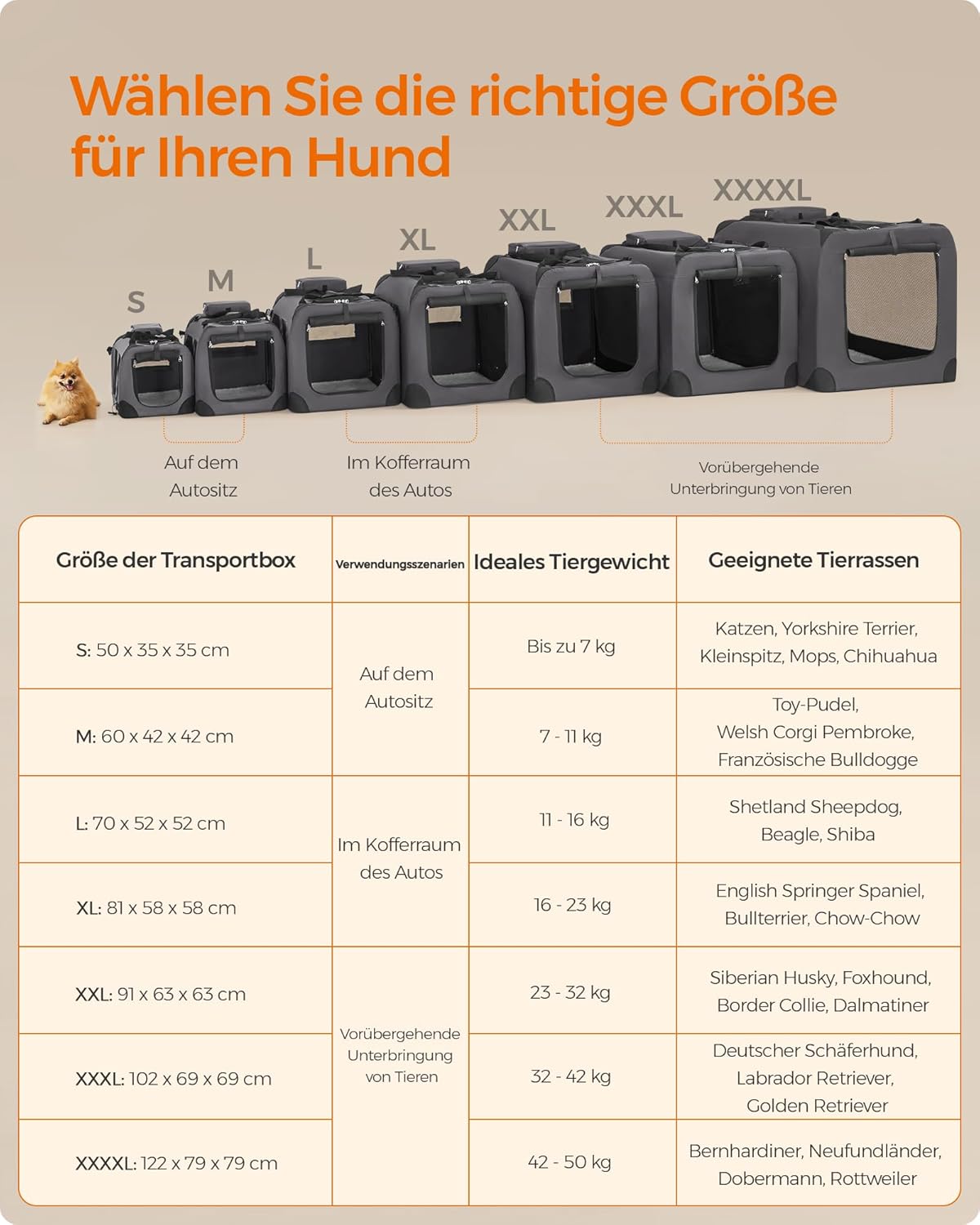 - [Die richtige Grösse feststellen] Die Hundebox (102 x 69 x 69 cm) ist ideal für Tiere mit einem Gewicht zwischen 32-42 kg. Empfohlene Rassen: Deutscher Schäferhund, Labrador Retriever, Golden Retriever. Beachten Sie die Hinweise für die richtige