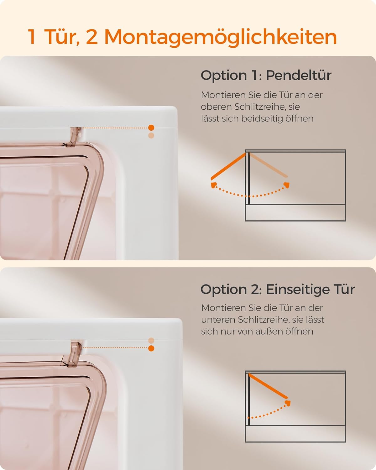• [1 Tür, 2 Konfigurationen] Die Tür lässt sich so einstellen, dass sie nur einseitig aufgeht und die obere Öffnung als Ausgang genutzt werden kann. Auch ein beidseitiges Öffnen der Tür lässt sich einstellen – je nach Bedarf. Wenn Ihre Katze ein