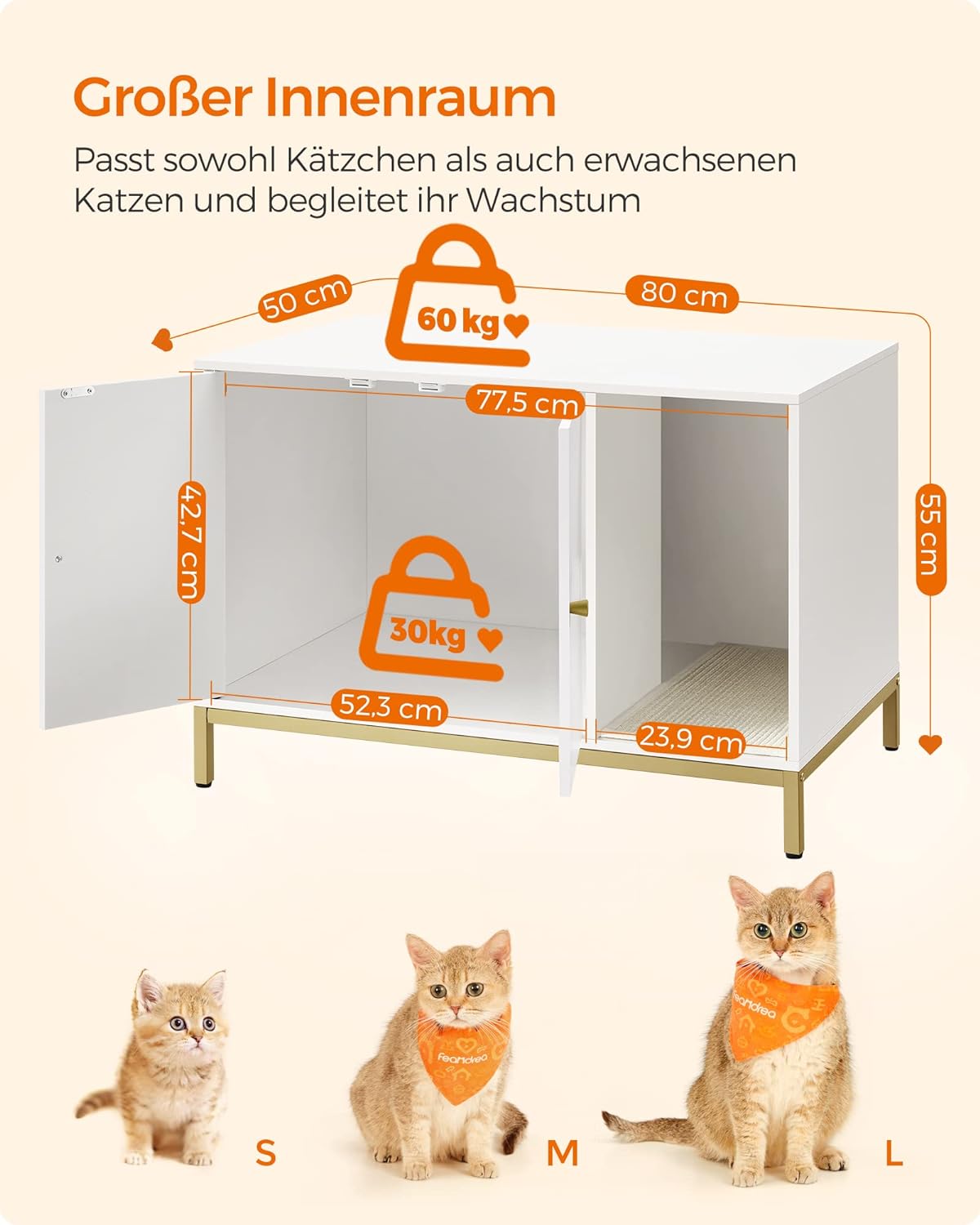- [Stilvoller Katzenklo-Schrank] Mit der weissen Oberfläche und dem goldfarbenen Metallrahmen lässt sich dieser moderne Katzenklo-Schrank leicht in Ihr Zimmer integrieren und verleiht dem unordentlichen Katzenklo-Bereich ein neues Gesicht