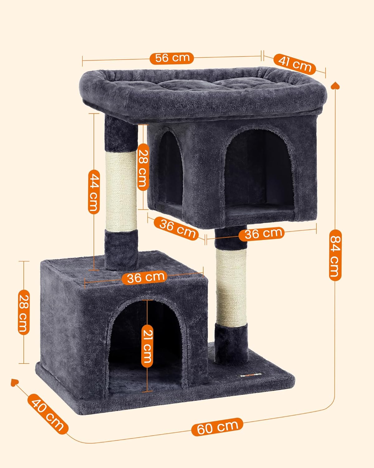 - Grosse Plattform: Dieser Kratzbaum mit einer grossen Plattform (56 x 40 cm) bietet Ihrer Katze genügend Platz zum Entspannen. Ideal für 1 grosse oder mollige Katze oder 2 kleine Katzen, die miteinander kuscheln