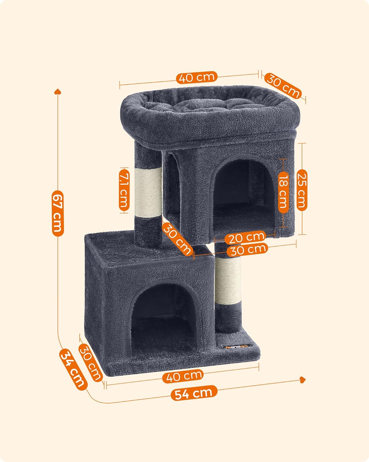 - [2 Katzenhöhlen] Durch die Doppelöffnung ist die obere Höhle der perfekte Aussichtsort und zudem leicht zugänglich. Die untere eintürige Höhle bietet ein ruhiges Schlafplätzchen und eignet sich auch für kleine Katzen, die das Springen noch nicht