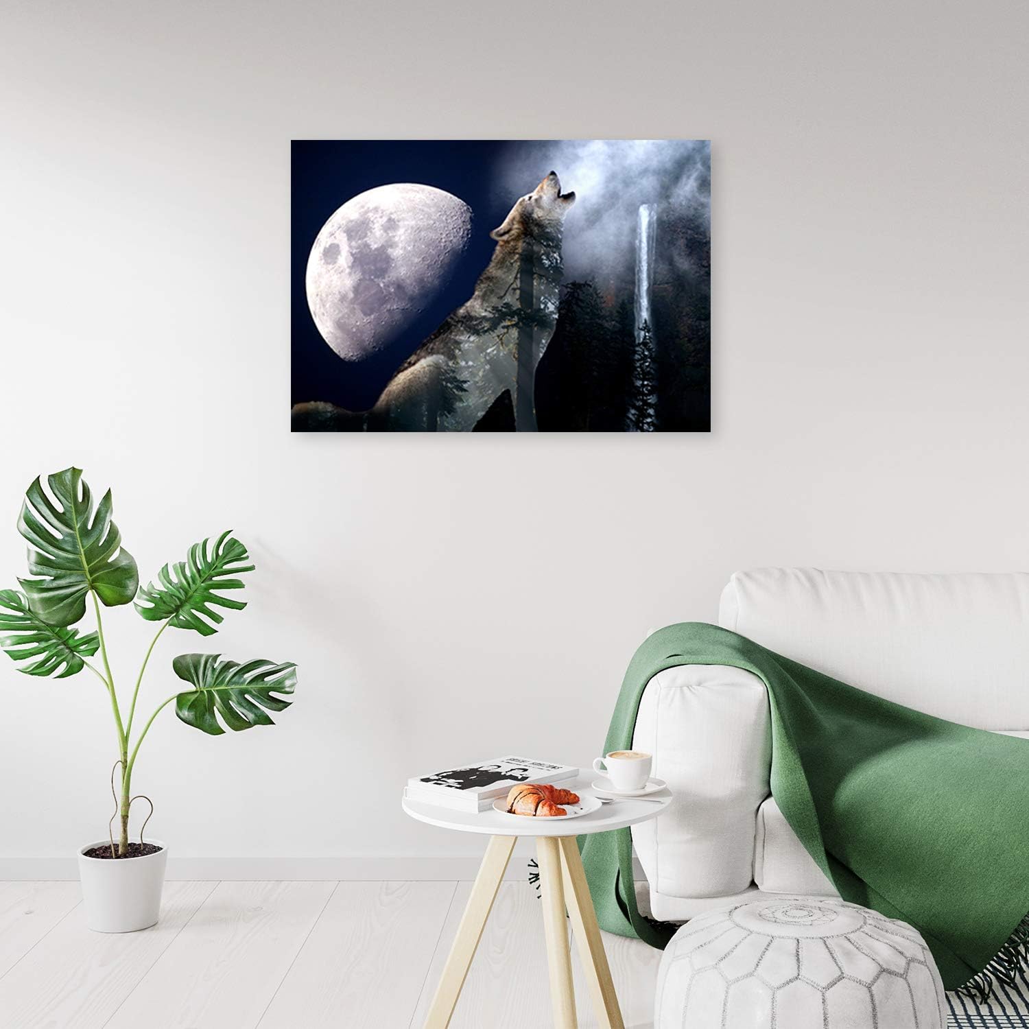 Feeby Bild auf Leinwand Wolf Kunstdruck modern Mond Blau 80x60 cm Leinwandbild 80x60 cm Blau_c, Lein