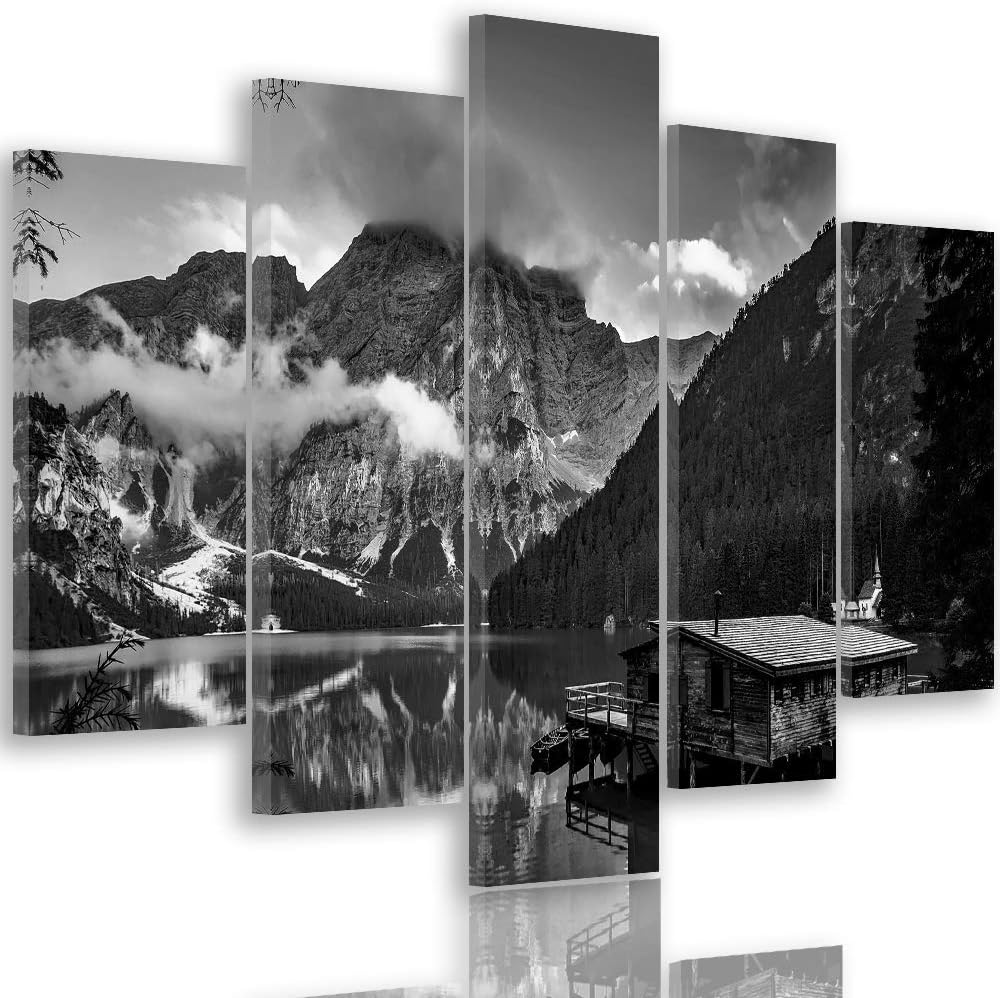 Feeby Bilder Berge 200x100 cm - Leinwandbild 5 Teilig XXL Kunstdruck Hütte See schwarz Leinwandbild