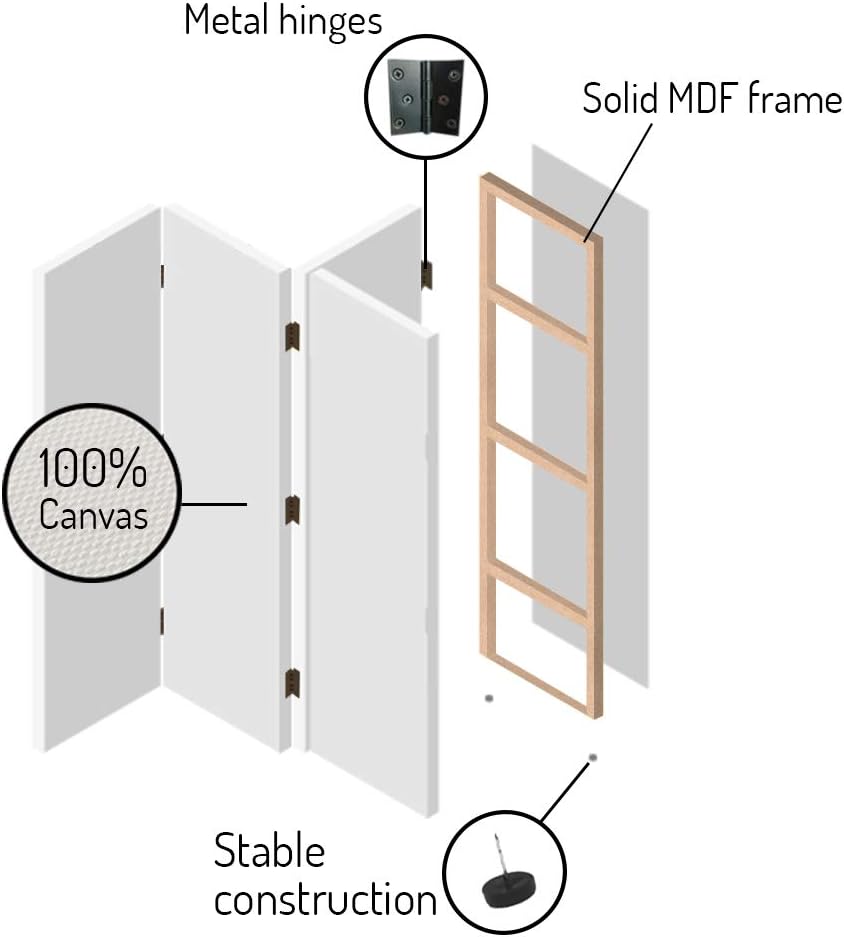 - EIGENSCHAFTEN: Raumteiler hat 3cm dicken MDF-Rahmen, solide Metallscharniere und eine wasserdichte, undurchsichtige Leinwand 260g/m2 mit hochqualitativem Digitaldruck.
