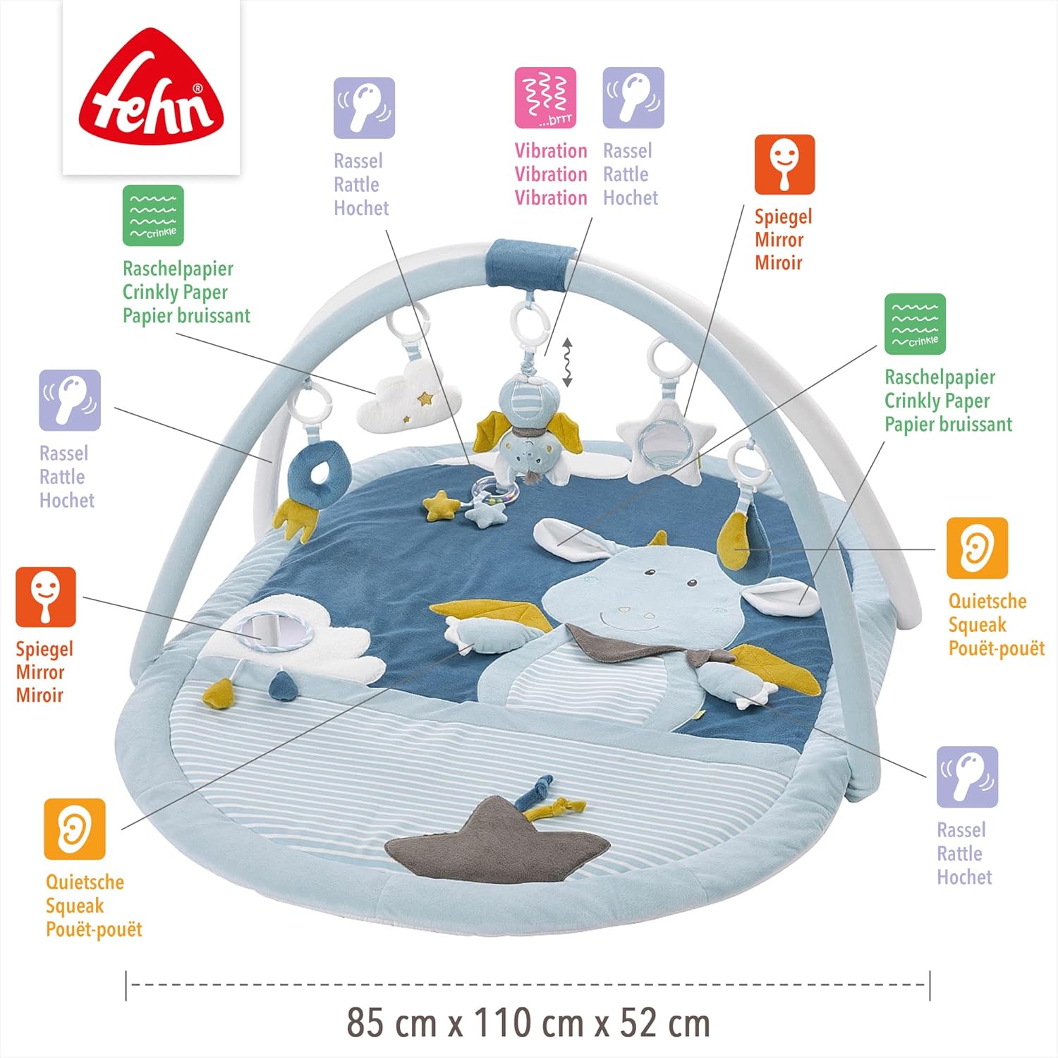 - Die ovale Krabbeldecke mit gepolsterter Liegefläche ist kuschelweich und schützt Mädchen und Jungen optimal bei der Erkundung der Welt des furchtlosen Drachen und der frechen Fledermaus